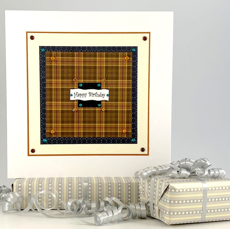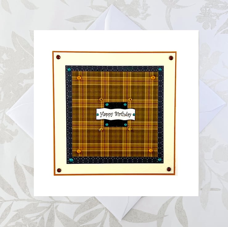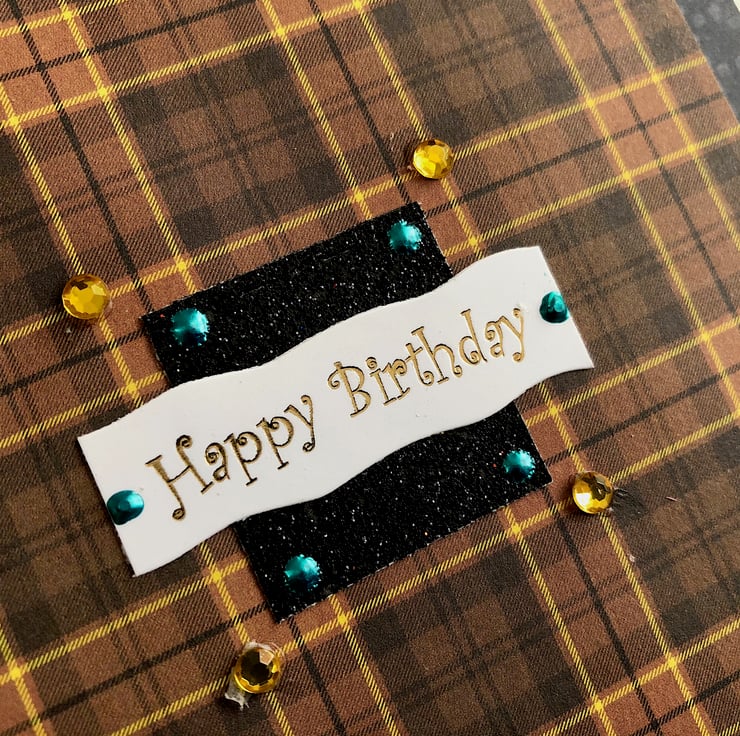 Handmade birthday card in a bold tartan design, made from tartan paper, embossed cream card and black glitter paper, trimmed with an abundance of yellow sparkling faux topaz, brown topaz and pearlised turquoise dots.