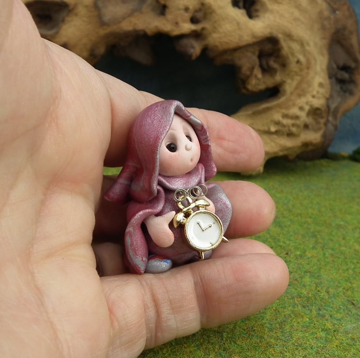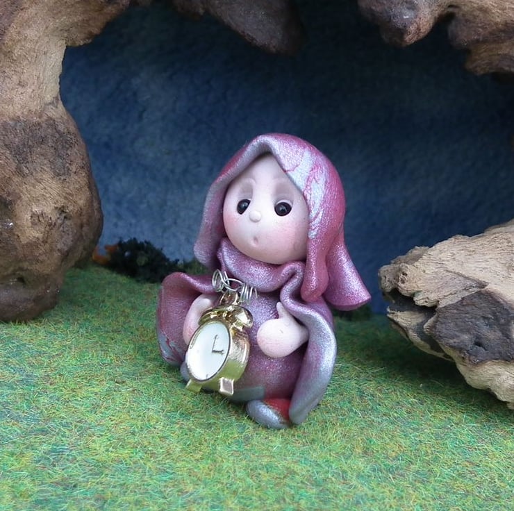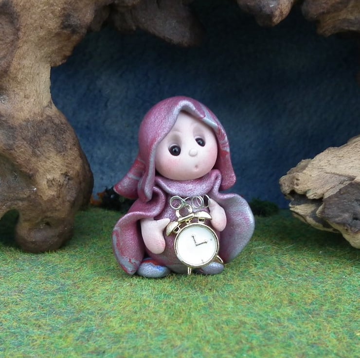 This is a 'one of a kind' creation having been entirely handmade without the use of moulds here at my studio on the Sussex Coast. Modelled with Prosculpt polymers, painted with heat set paints before sealing with lacquer, Tock has sparkling black onyx eyes. Tock the Timekeeper Gnome is just one and a half inches tall.