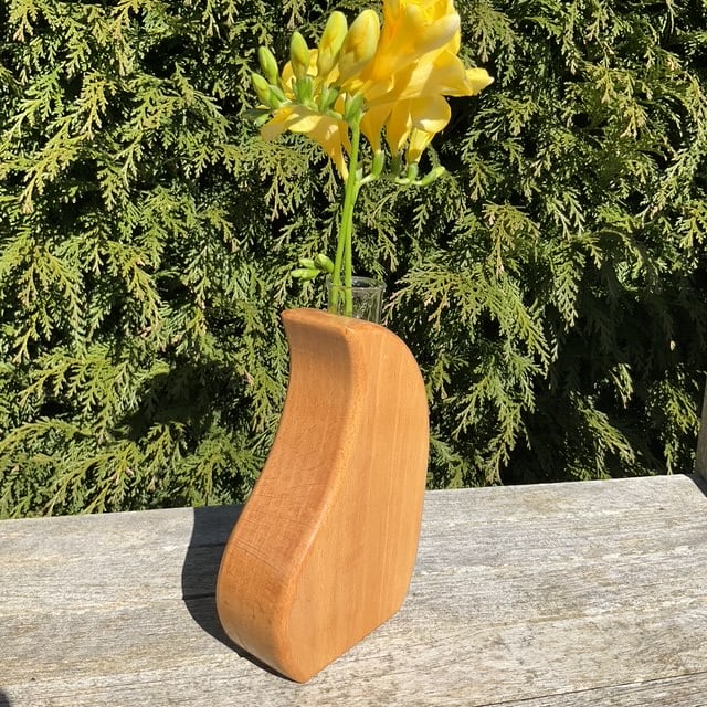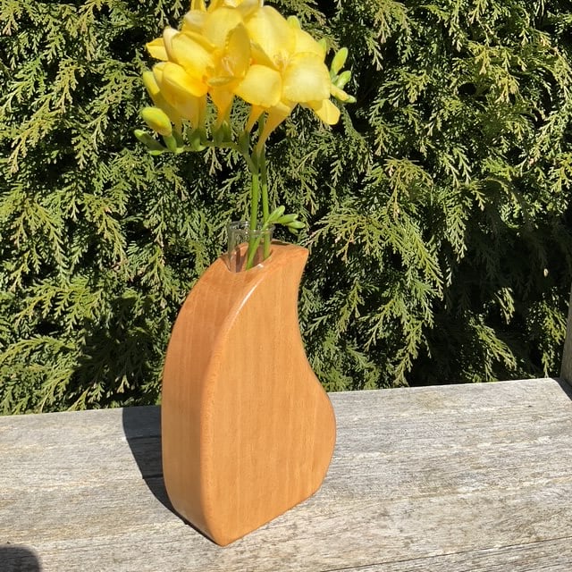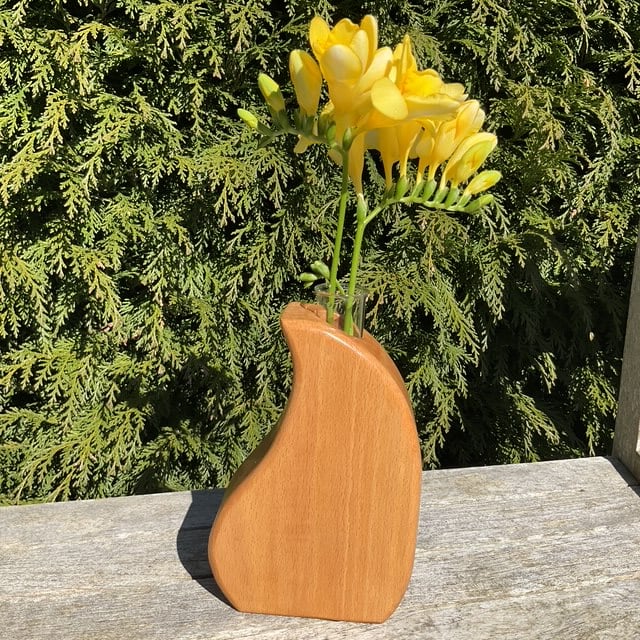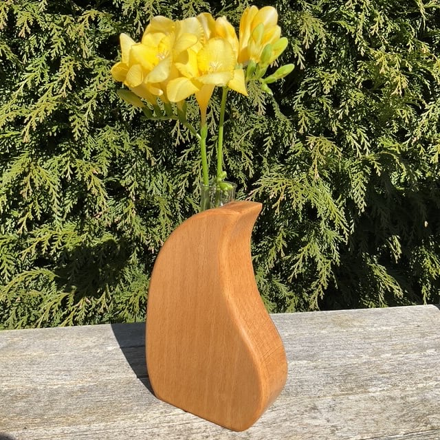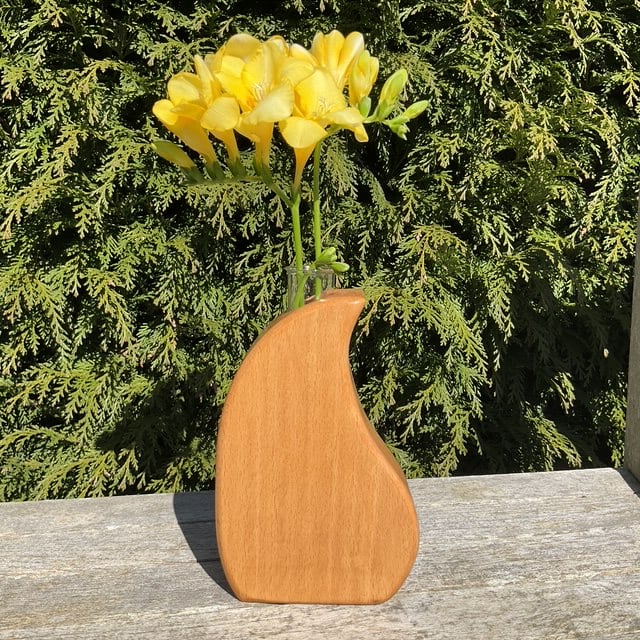 A stylish bud vase made from beech wood in an flame shape holding a glass tube. The vase is finished in danish oil to a light satin finish. The vase overall dimensions being 155mm x 165mm x 44mm thick. The tube vase 150mm high x 24mm diameter.