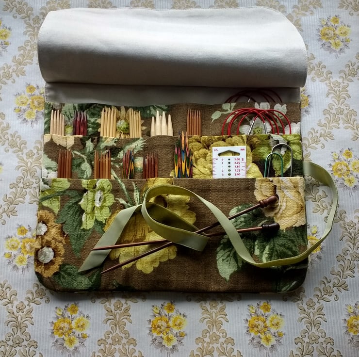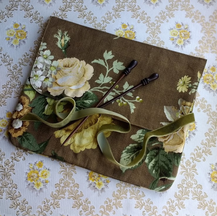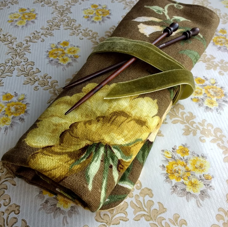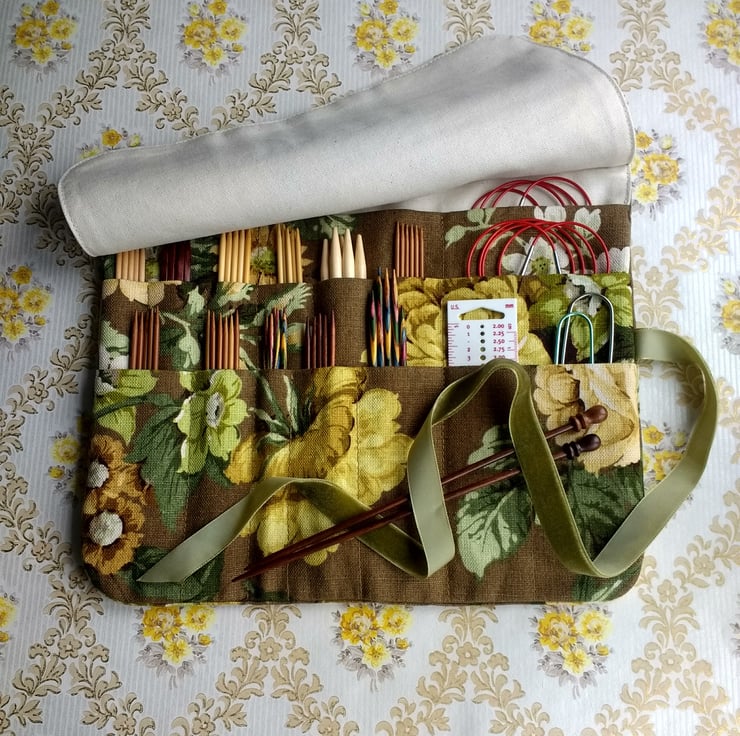 Made from time softened and re-purposed vintage furnishing fabric, the Georgie wrap is the perfect place to store mainly an assortment of double pointed knitting needle and fixed circulars, along with other accessories such as pair of scissors and a needle gauge...