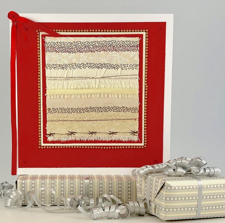 Large size of just under 8 inches square (20cm). Made with layers of lovely cream fabrics to form an abstract textile design, which has been mounted onto red quality card and embellished with golden pearls.. Complete with white envelope and edged in a quality red ribbon.