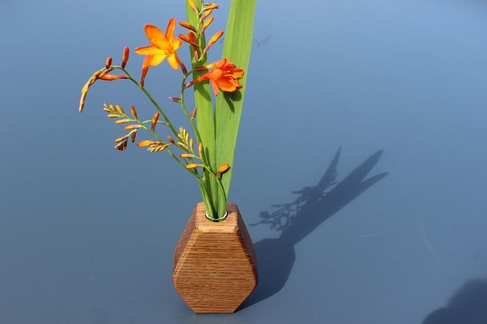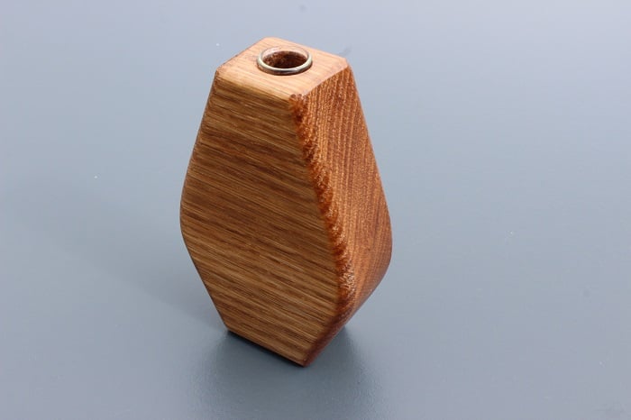 A handmade oak bud vase having a single removable glass test tube. The wood casing has several coats of lacquer applied providing a hardwearing, water resistant, satin finish.