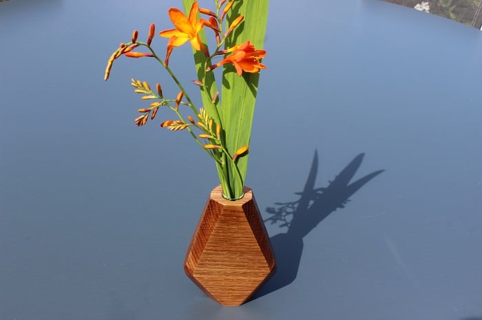 A handmade oak bud vase having a single removable glass test tube. The wood casing has several coats of lacquer applied providing a hardwearing, water resistant, satin finish.