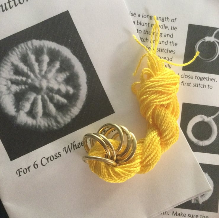 The kit contains full instructions with plenty of photographic illustrations and suitable thread and rings to make six buttons. Also included is a short background to the history of Dorset buttons.