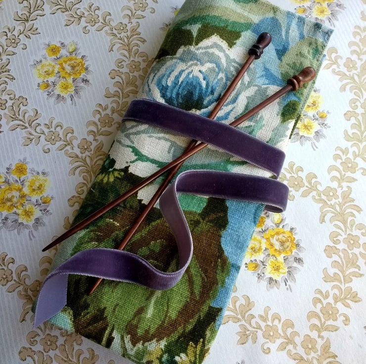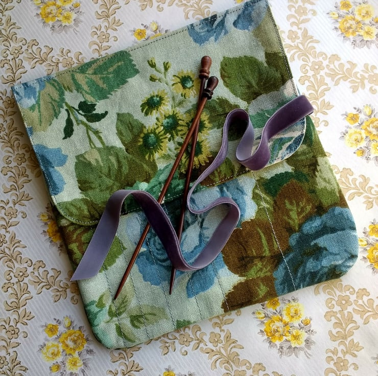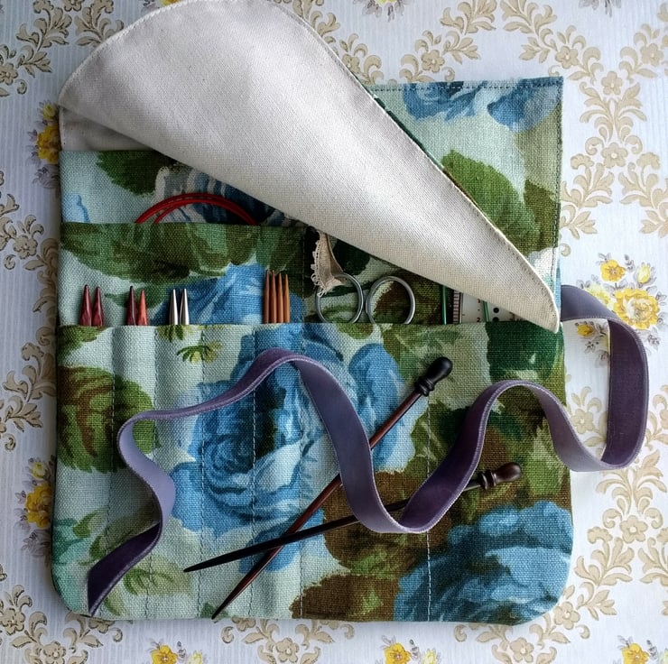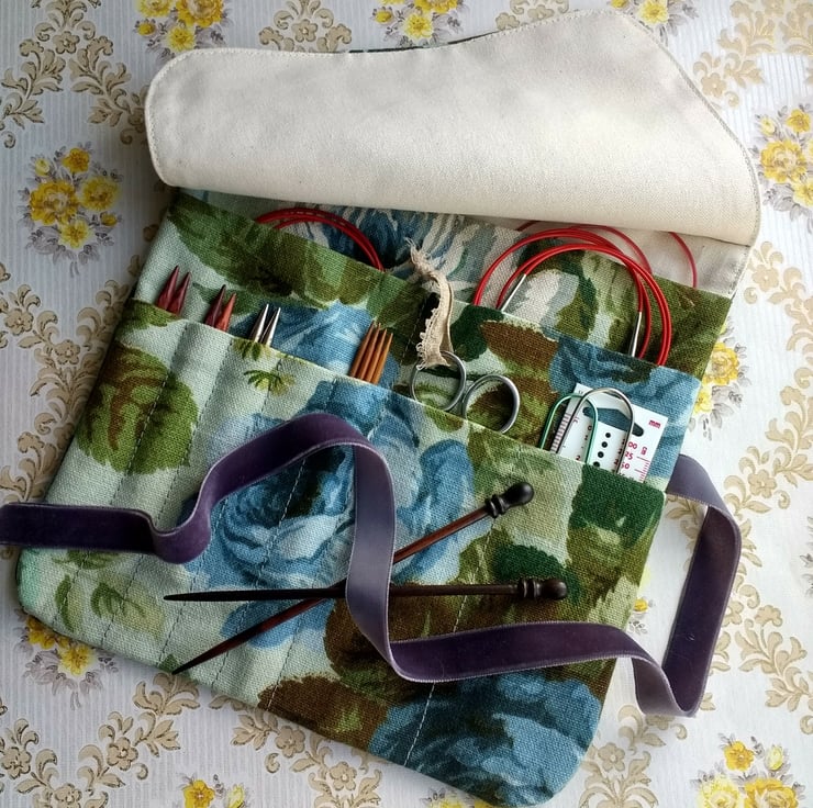 Made from time softened and re-purposed vintage furnishing fabric, the Lara travel wrap is the perfect place to store an assortment of needles,crochet hooks, gauges and scissors when you go off on an adventure or holiday.