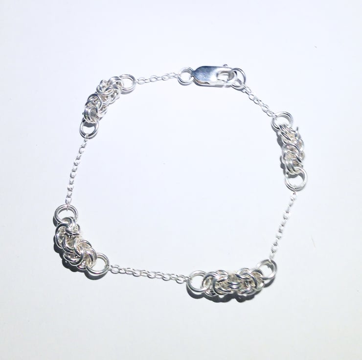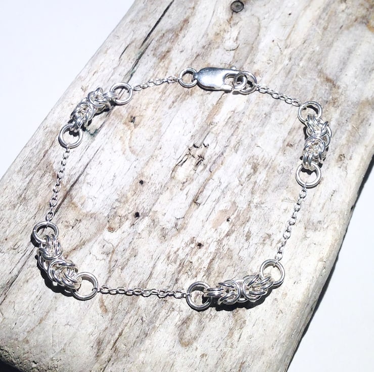 I have created this elegant bracelet from handmade byzantine design chainmaille sections combined with sterling silver chain and a sterling silver lobster catch.