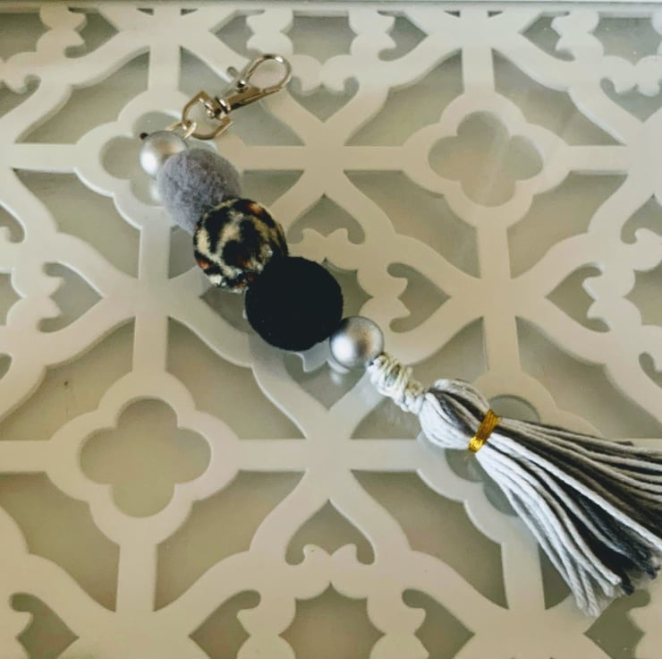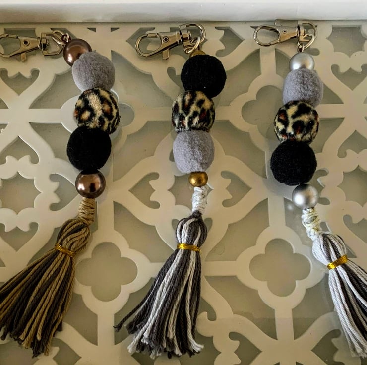 Black / Leopard / Grey pom poms. Featuring silver ball beads with a mixed grey cotton tassel.