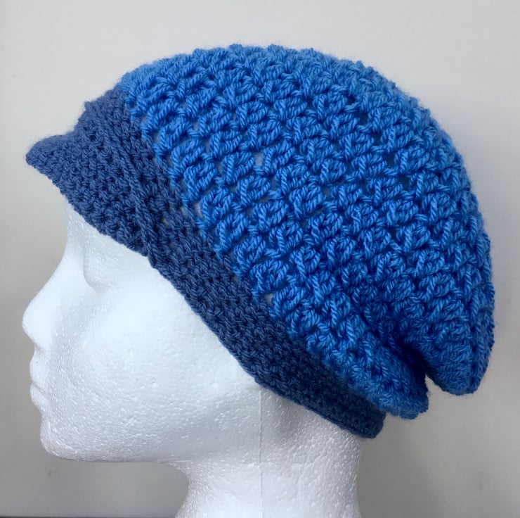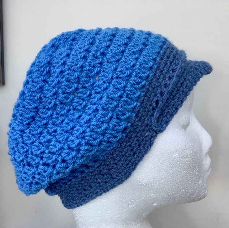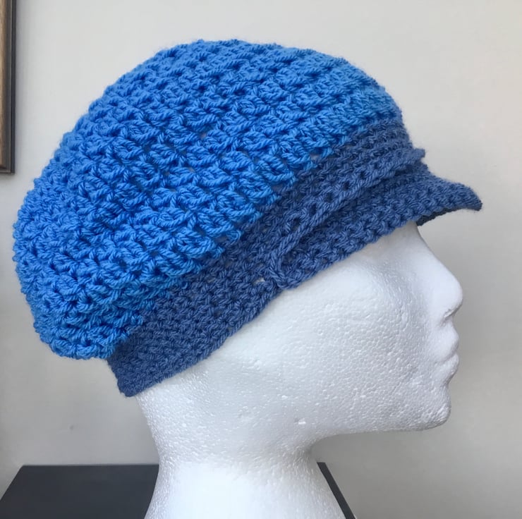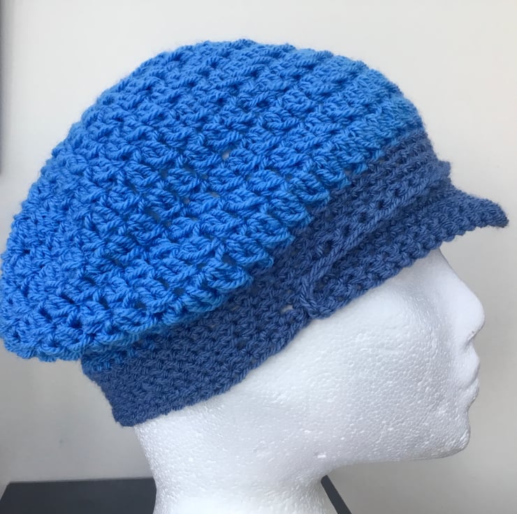 Dual Blue Baker Boy Style Crocheted Hat or cap for the young lady who likes something a bit different.