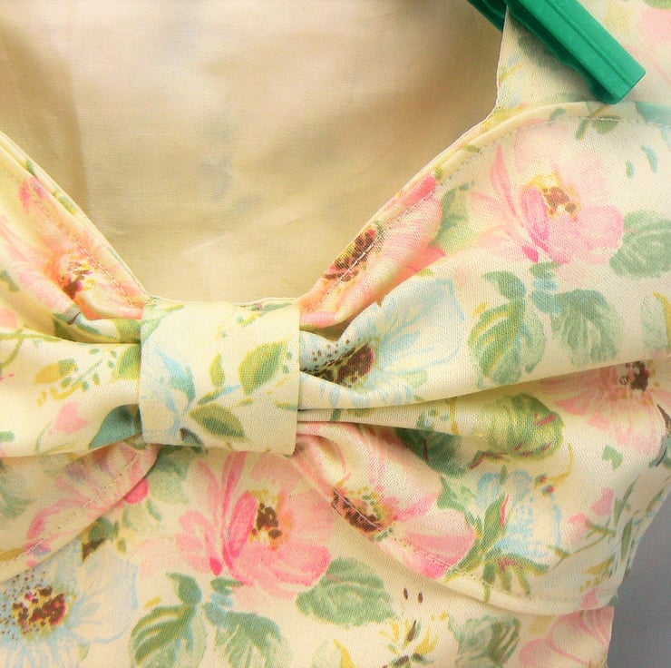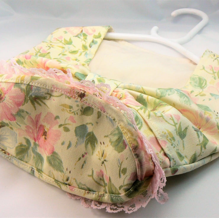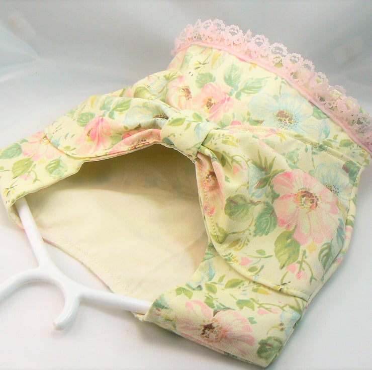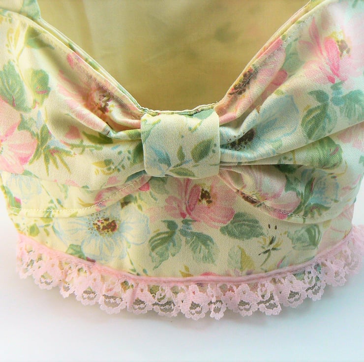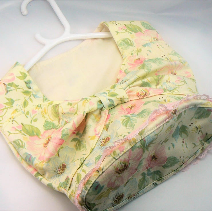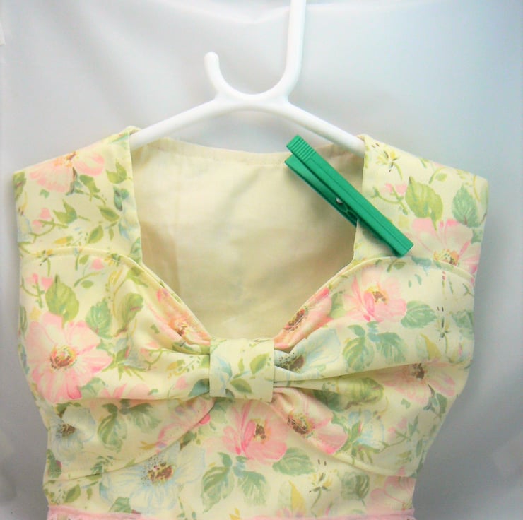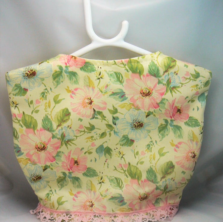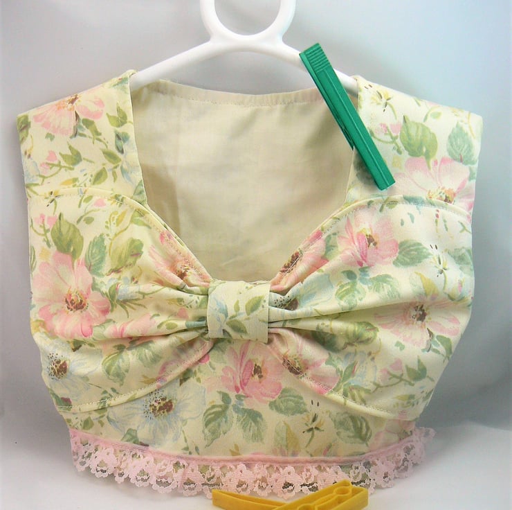 I have made this peg bag out of lovely floral material in pastel colours and lined with cream polycotton. I thought a little crop top style, with bow would look great for a peg bag. As you can see from some of the photos I have designed it with a gusset at the bottom which makes it much easier to put your hand in and get the pegs out and this part has a very strong interfacing built in. I have not used a child hanger but cut down a adult size one as it is much stronger (easily removed for washing).