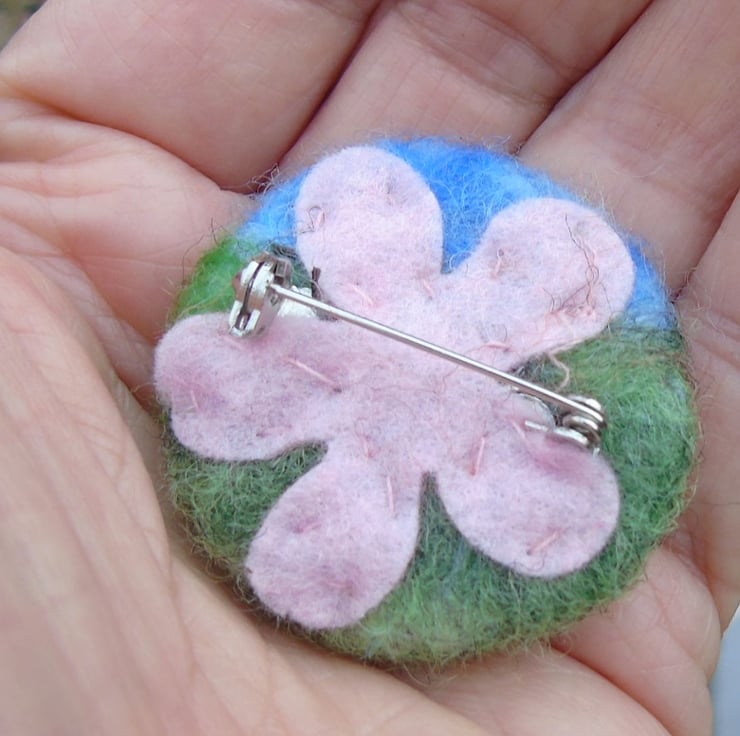A brooch safety fastener has been securely sewn onto the reverse and a pink felt flower added to cover up the metal base of the fastener.