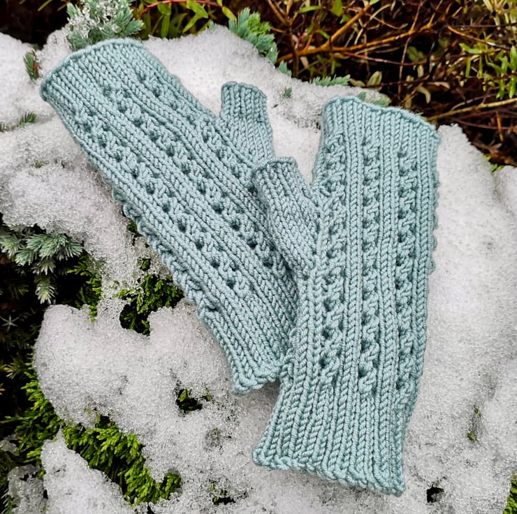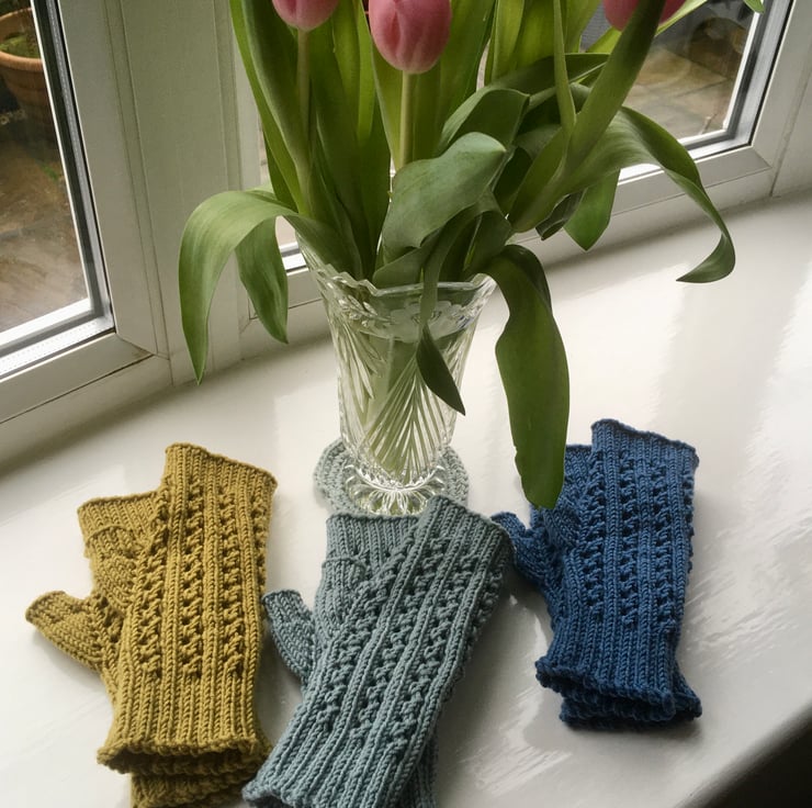 I have hand knitted these using a lovely 100% merino wool yarn in a lovely duck egg blue colour. They are knitted in the round so there are no seams. They have a lacy ribbed stitch which gives a lovely stretchy fit and there is also a place to keep your thumb warm too.