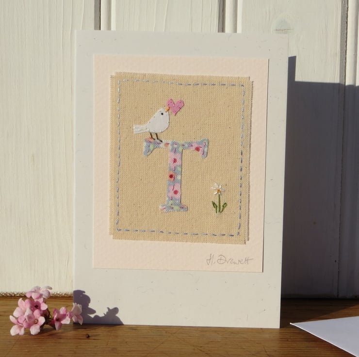 A small hand-stitched textile mounted onto a card with the letter 'T' cut from pretty floral fabric stitched into place with tiny stitches. I have added a miniature applique dove with heart in her beak, and then embroidered a tiny daisy flower to complete the design.