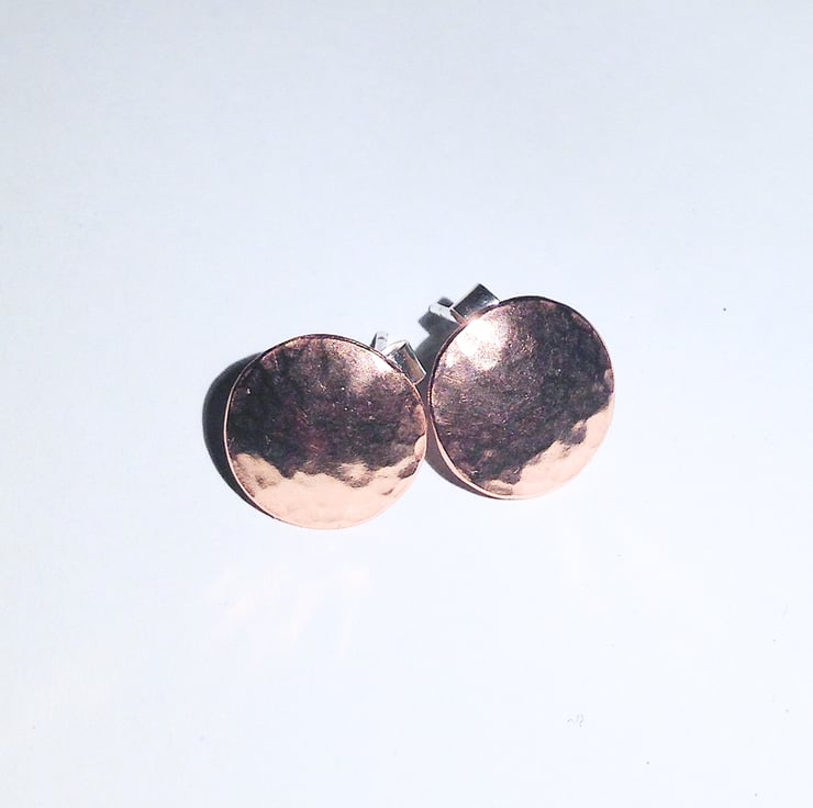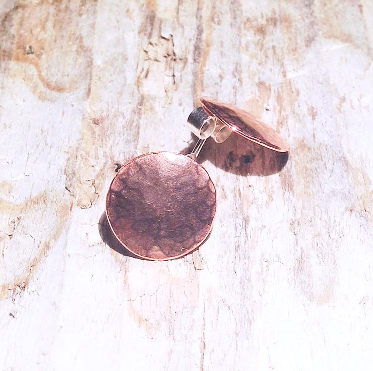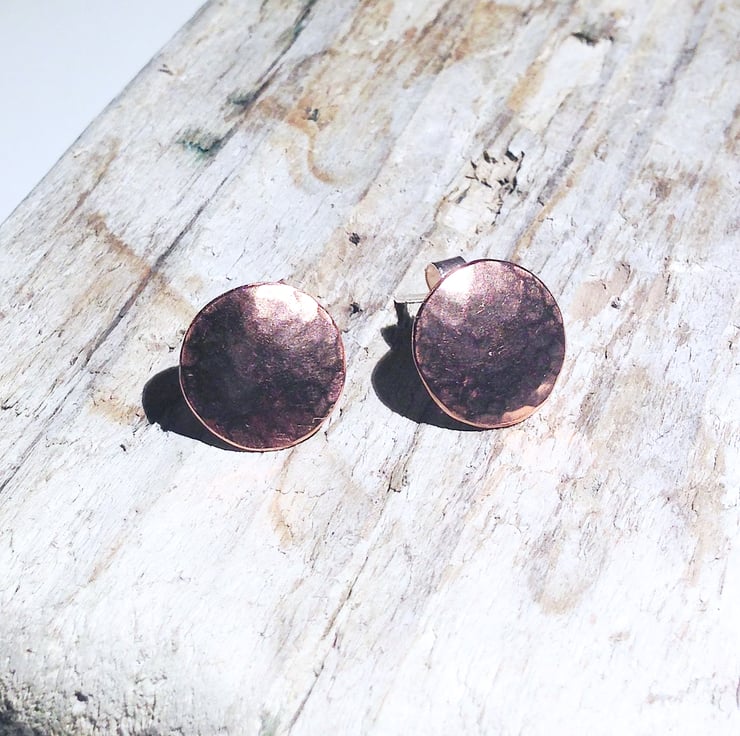 These beautiful earrings are made from hand sawed and hammered copper discs which have been slightly domed for an interesting effect.
