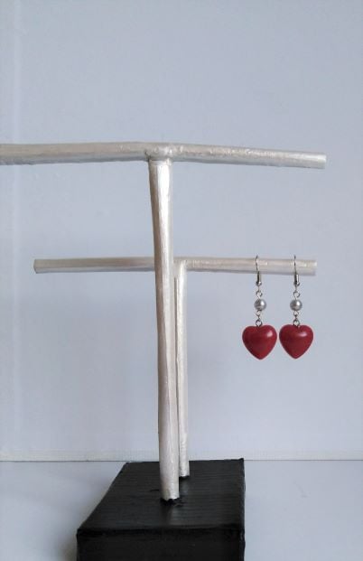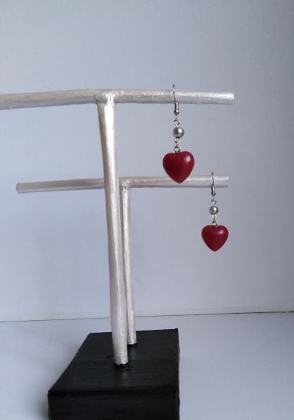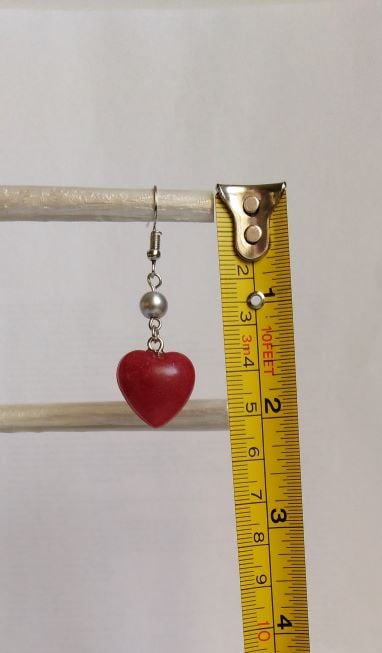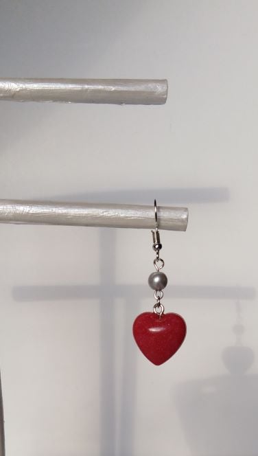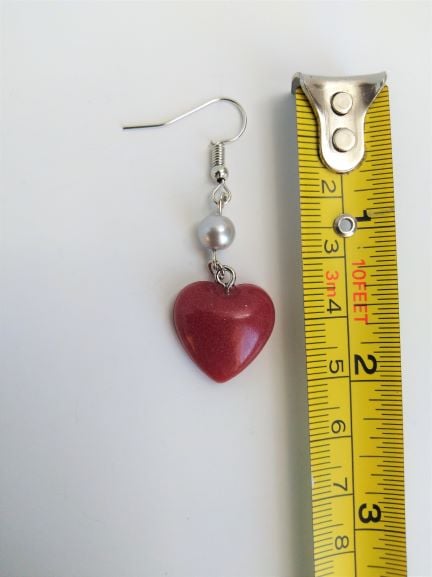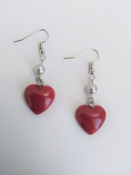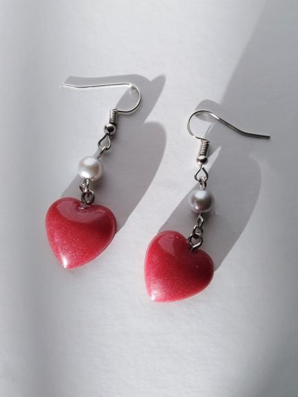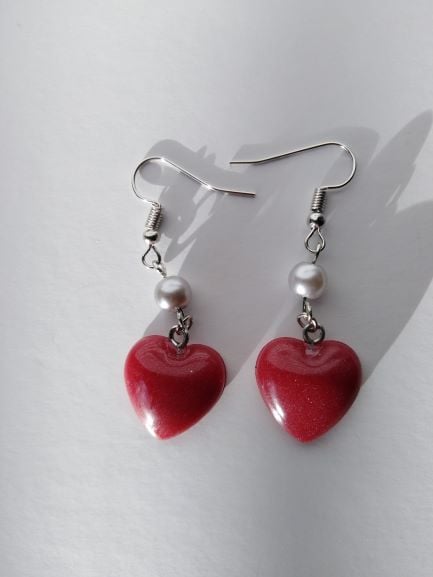 Cute hand made (NO VOC, NO BPA) Non yellowing arts and craft epoxy resin red heart earrings with a pearl sheen.