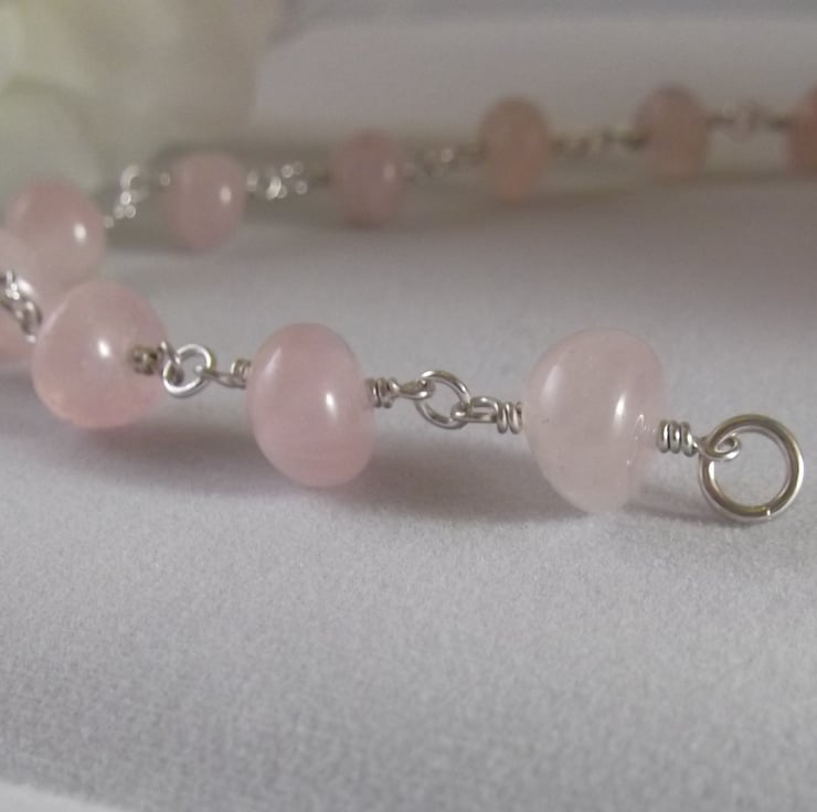 The 10 rose quartz beads have a double twist loop at each end and are joined together with small sterling silver jump rings.