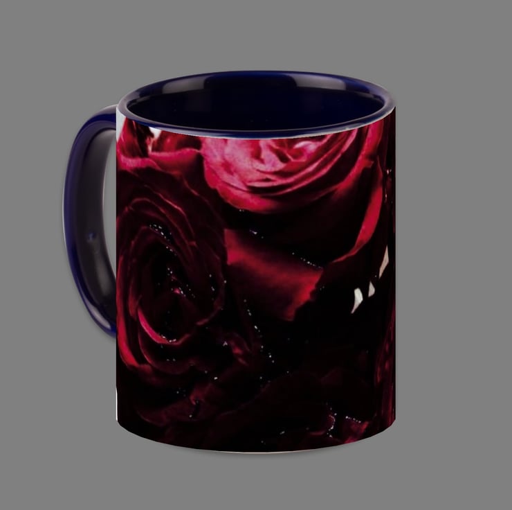 THE MUG CAPTURES THE IMAGE OF A BOUQUET OF ROSES IN ABSTRACT FORM.