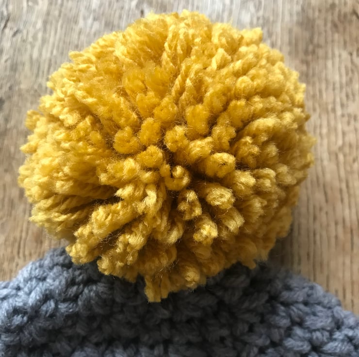 A wonderfully snug and warm grey hat crocheted from a soft chunky yarn making it super cosy. It has a double brim to help keep ears extra warm and is finished with a huge mustard Pom Pom.