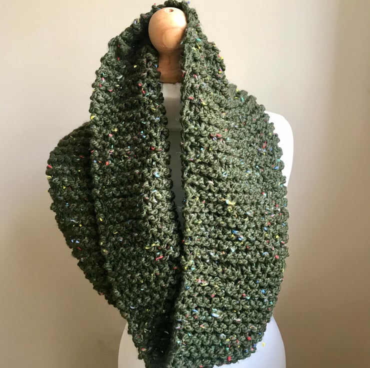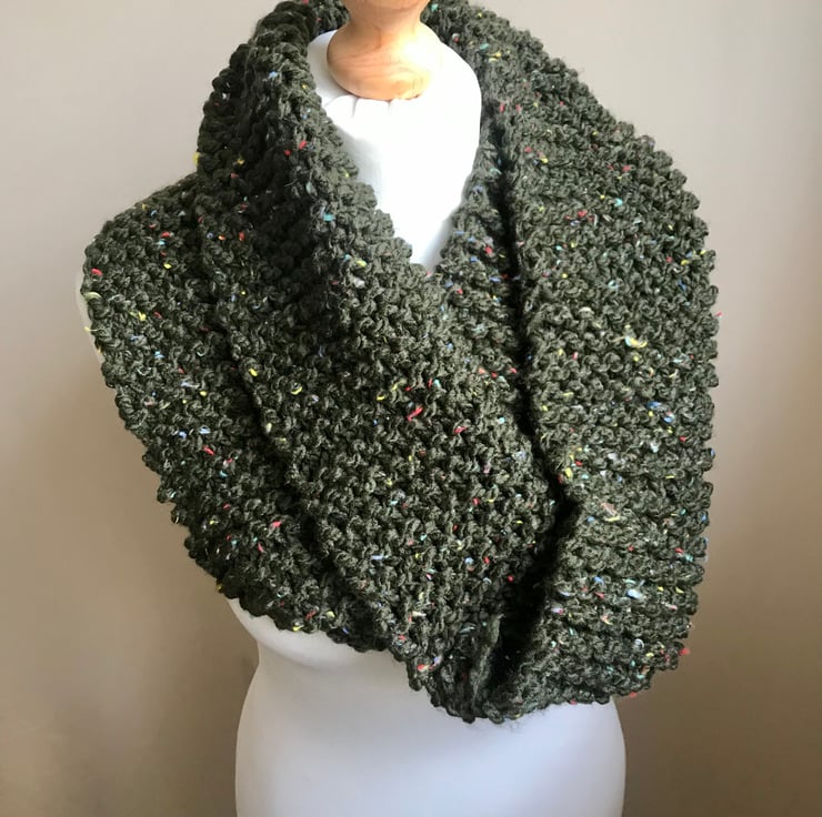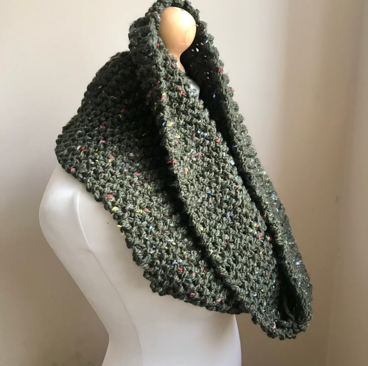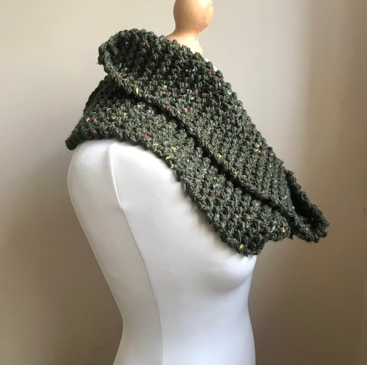 This cowl is positively spongey and springy. It is hand knit in dark green soft acrylic yarn and is very wide with lots of room to fold it and wrap it. The yarn has tweedy flecks if could running through it which really brings the cowl to life. It is very warm and just a little bit of luxury.