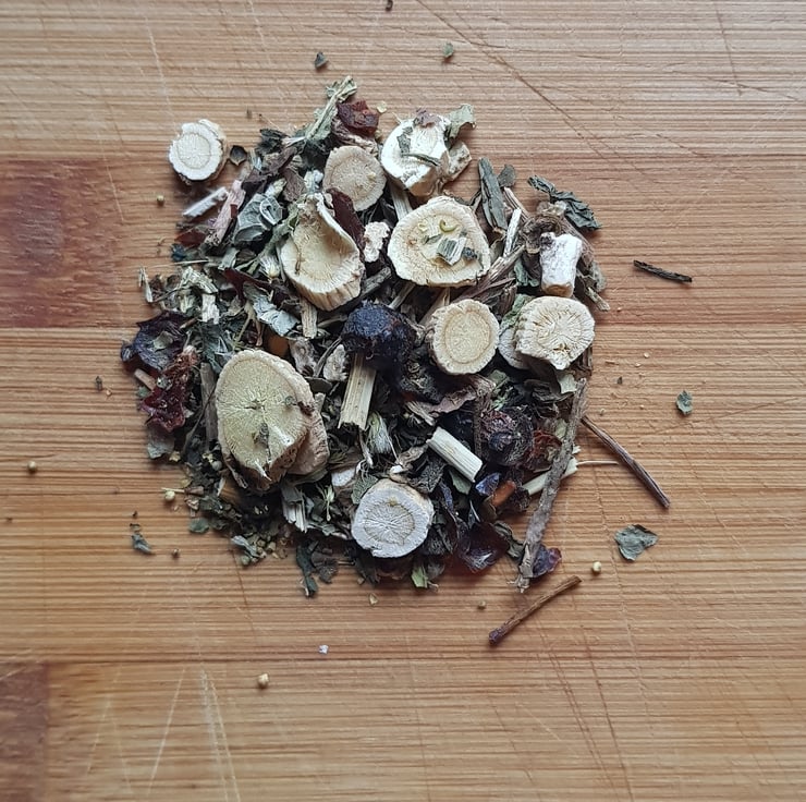 Astragalus root, Rosehip, Dandelion leaf & root, Meadowsweet, Nettle, Golden rod.