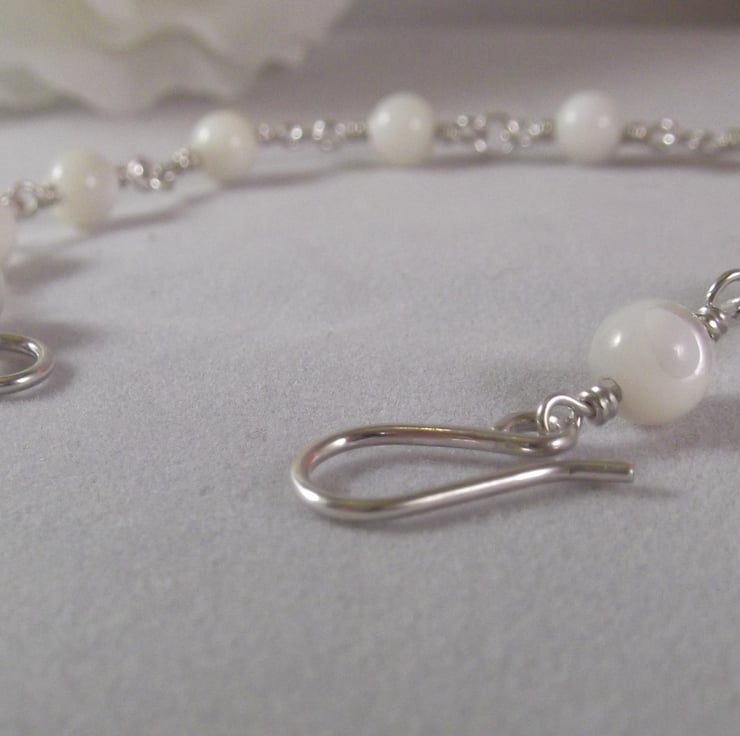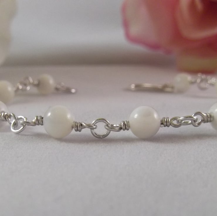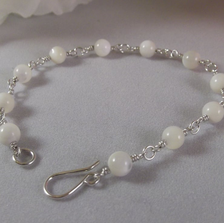 This pretty delicate looking bracelet has been made using 6 mm mother of pearl beads and sterling silver wire.
