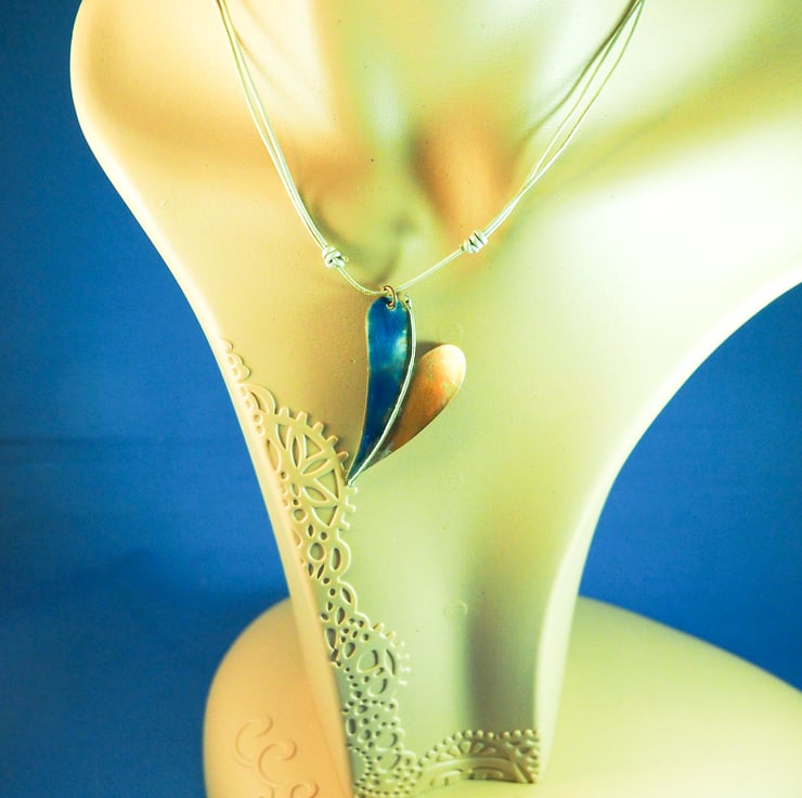 A copper, off centre, heart pendant with a length of silver wire fused along it's length. The left half has been enamelled, with low temperature enamel, in translucent dark blue. The silver is fused to the copper by using a blow torch on it until it melts and fuses to the surface, while still keeping the appearance of wire. The silver has spread more at the point of the heart so the enamel is lighter there and the other half has a coating of silver at the point of the heart.