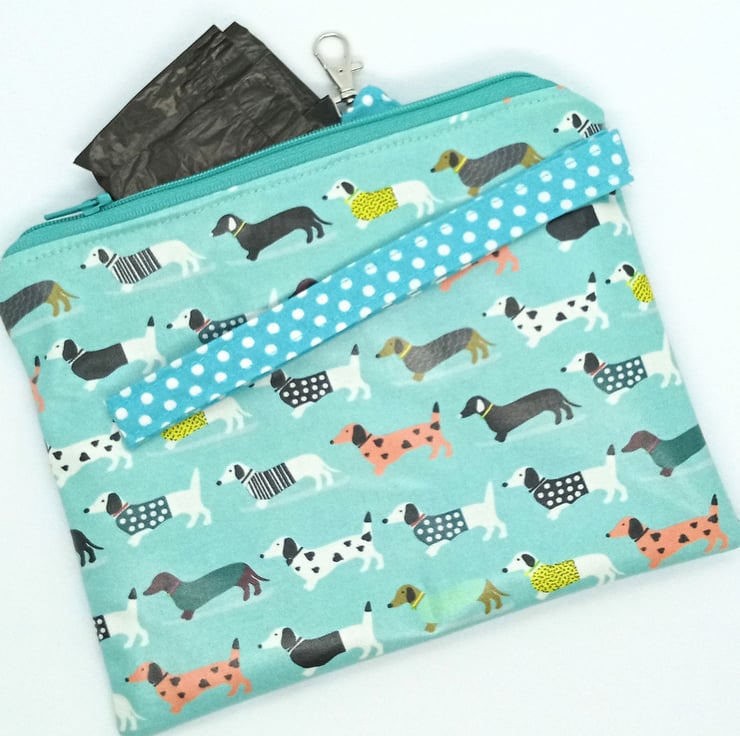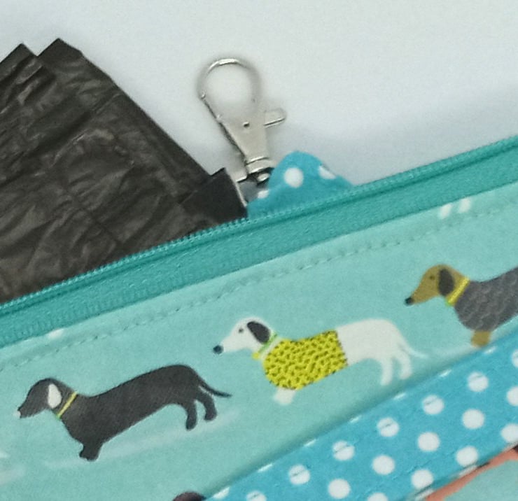 A 19 x 14 cm lined pouch in wipeable fabric to keep those little black bags handy on your daily walk. This will look so much better than having your pockets stuffed with poo bags. The lining is pale blue cotton with white spots.