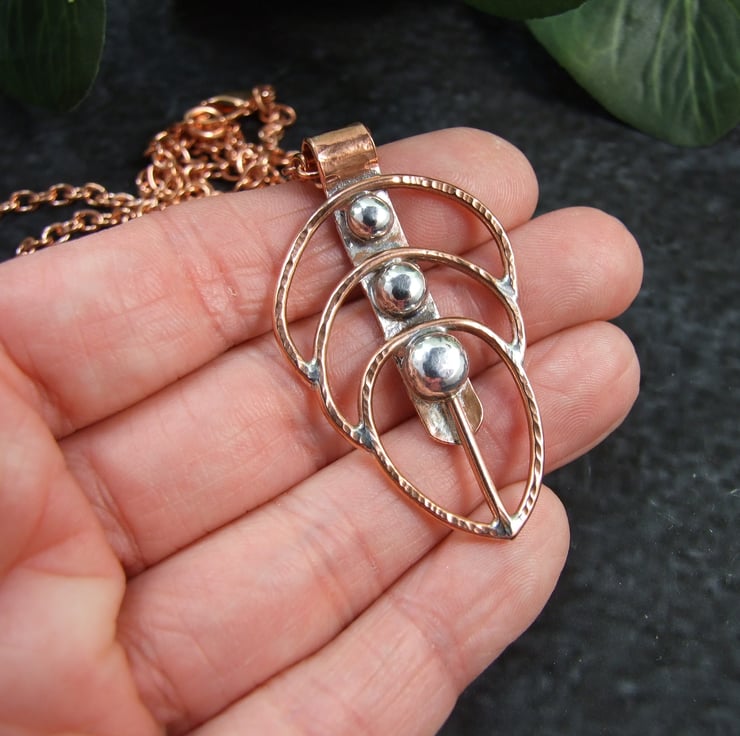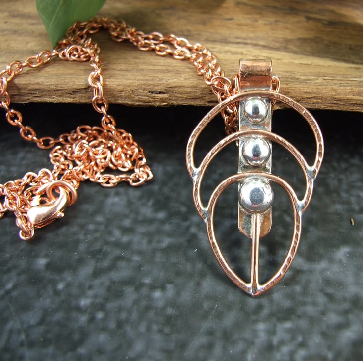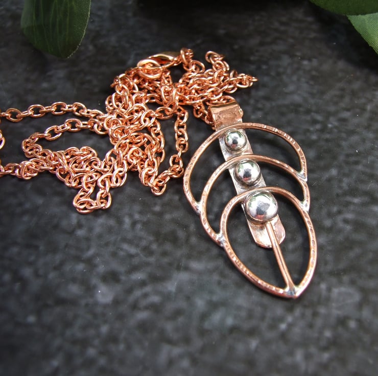 I created the feather by hand from copper wire of varying sizes shaped into a feather outline, down the centre are three sterling silver nuggets made from recycled silver heated to melting point when it forms a natural nugget, these were then soldered into place. Fitted to a log 26 inch pure copper chain. Pendant measures approx 40mm long.