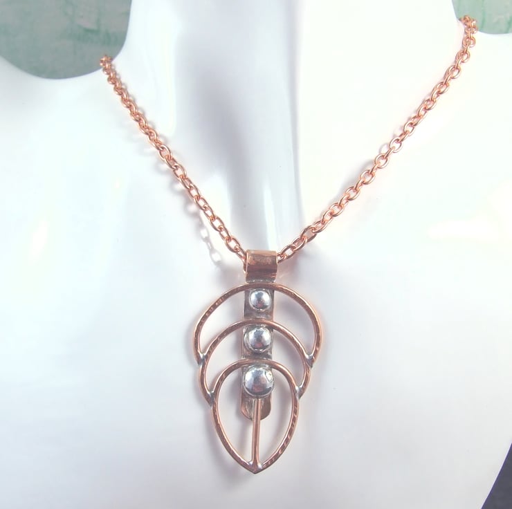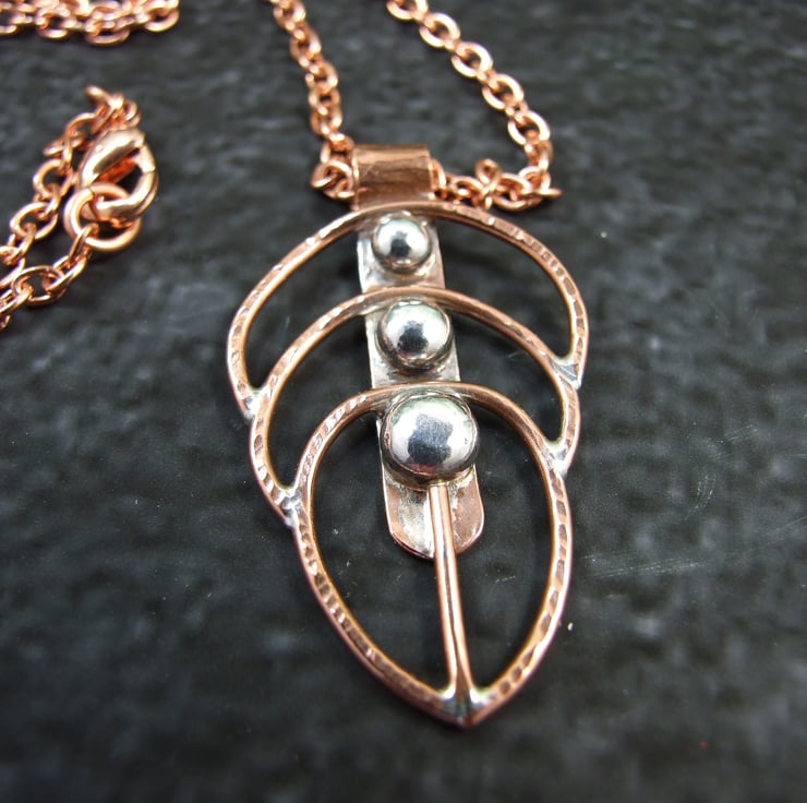 Feather Pendant. Handcrafted Feather from Copper and Sterling Silver on long 26 inch pure copper chain.