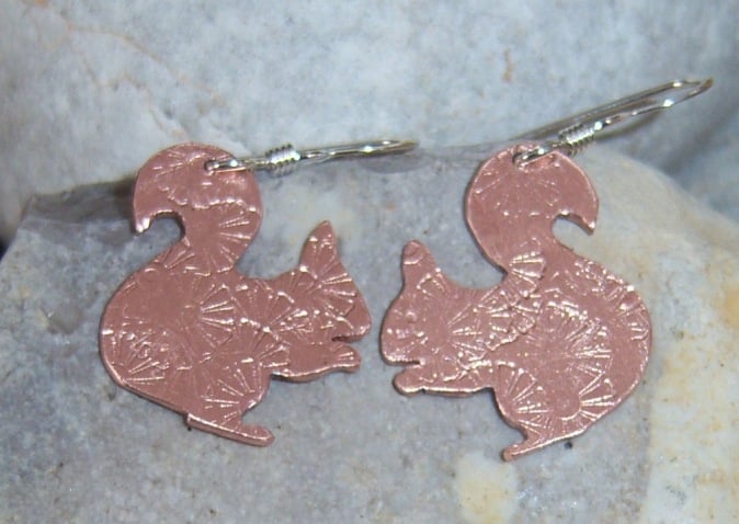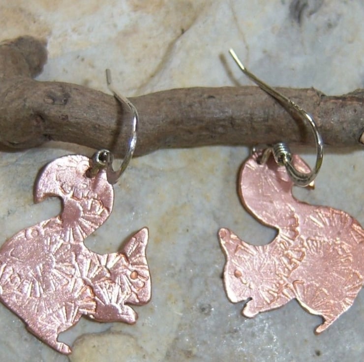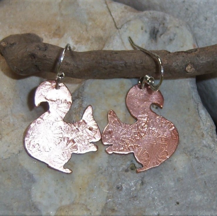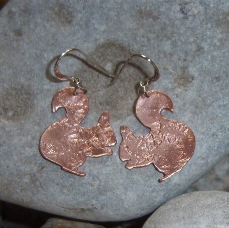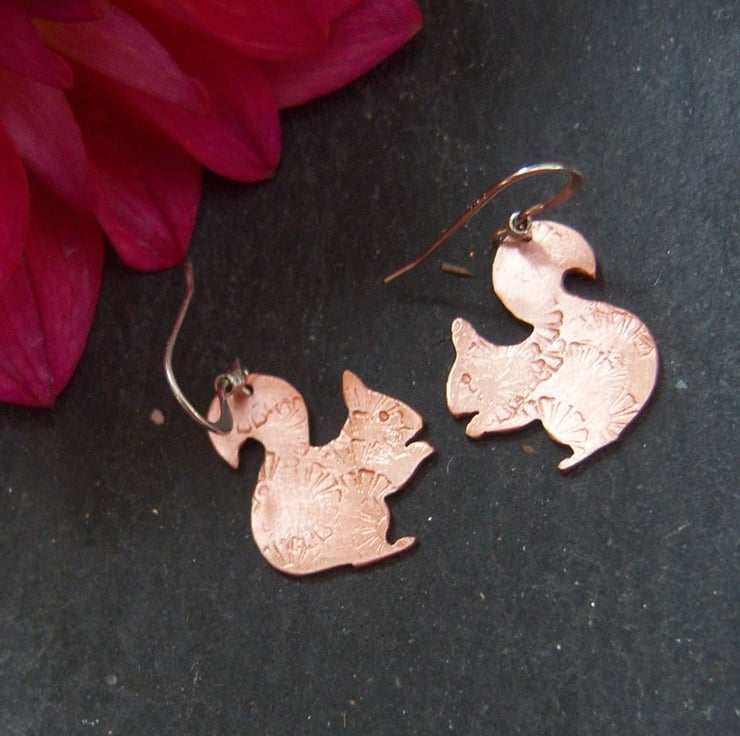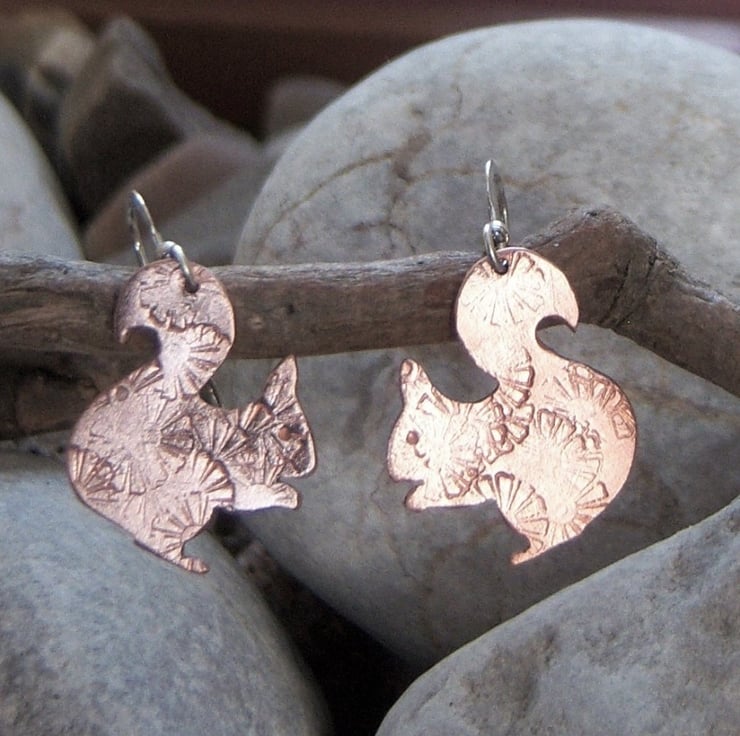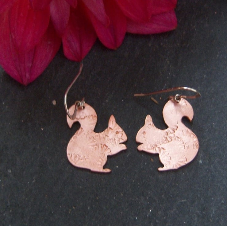 Squirrels cut from copper sheet and imprinted with a random flower design. The squirrels are approximately 1.7cms tall and wide. Sterling silver ear wires.