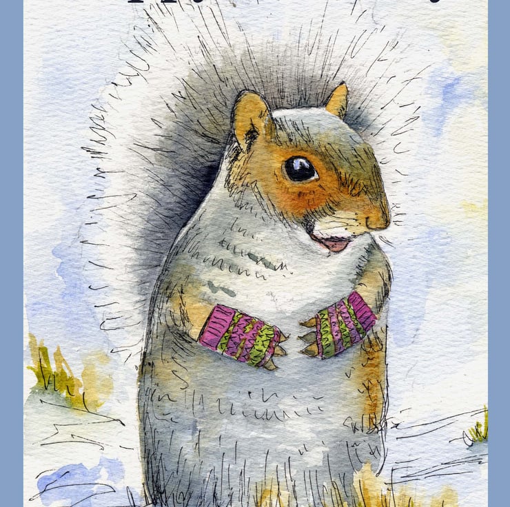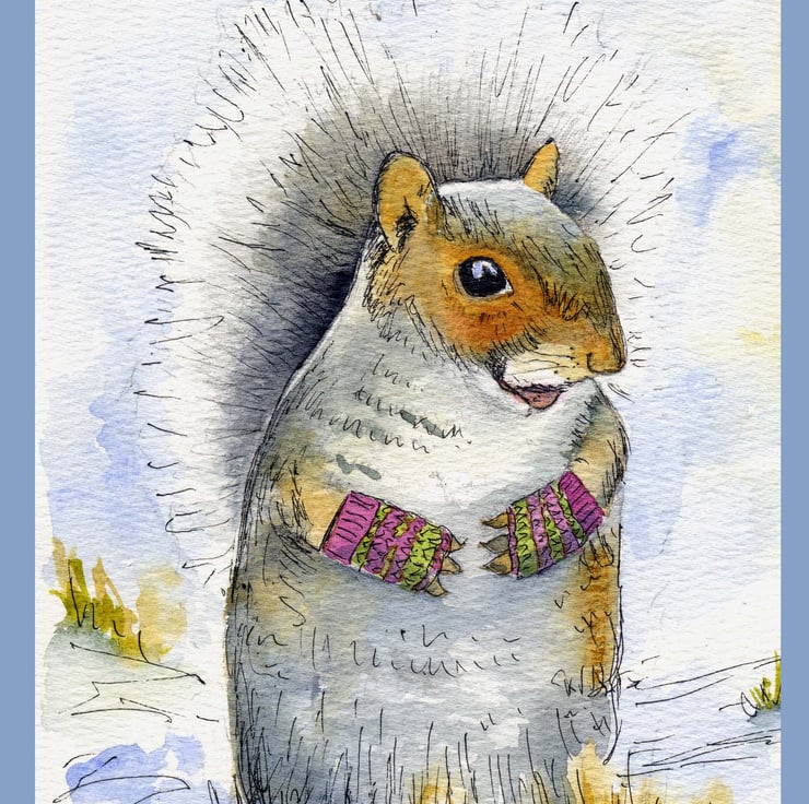 Little squirrel, with gloves, in the snow, so happy to have gloves to keep his fingers warm.