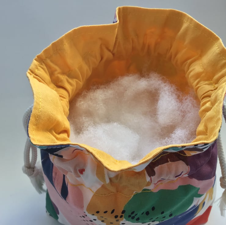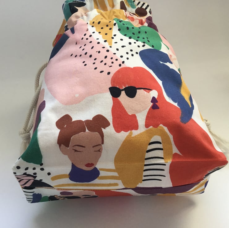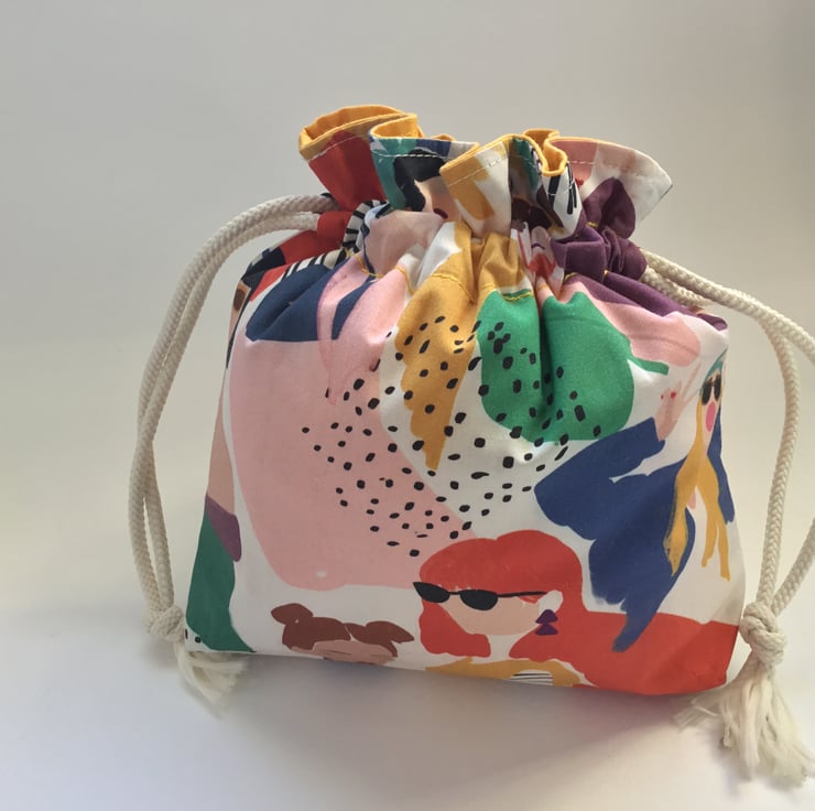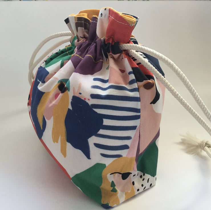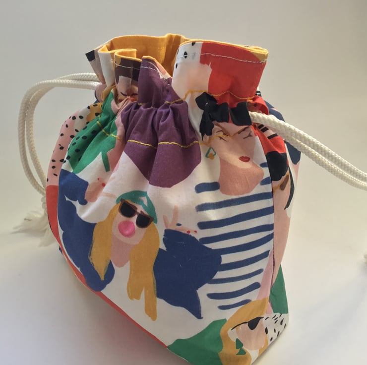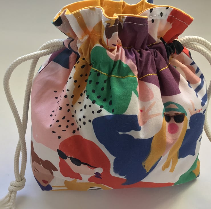 Drawstring bag made from a fun Lady McElroy fabric and lined in an ochre cotton. The bag has a squared bottom to stand up. Useful for make up, hair accessories, reusable gift bag.