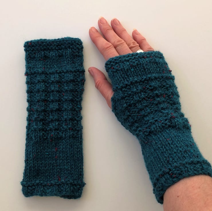 These dark teal blue tweed soft fingerless mittens / wrist warmers / gloves are knitted with a pretty waffle pattern. They are made from 25% Aran tweed wool with little flecks of red and teal green and are 8 inches long.