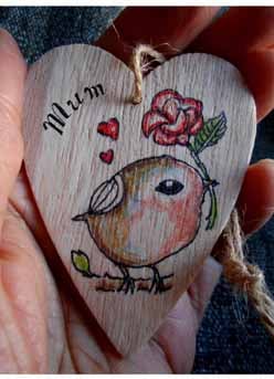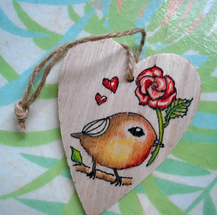 This beautiful wooden hanging decoration features a handdrawn robin holding a rose in its beak which it wants to gift to the recipient! I draw the design directly on to the heart using, pencil and pen.
