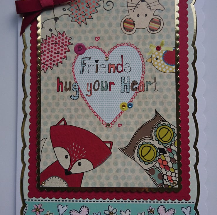 The design is a fox, a bird, an owl, a mouse, and two hedgehogs, all with big happy smiles on their faces. A love heart is in the centre of the design and the sentiment says "Friends Hug Your Heart".