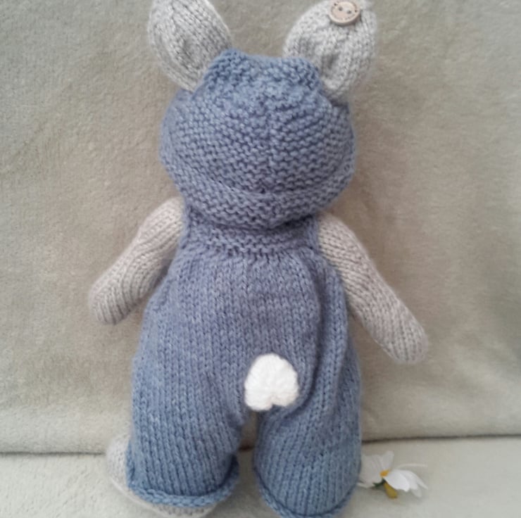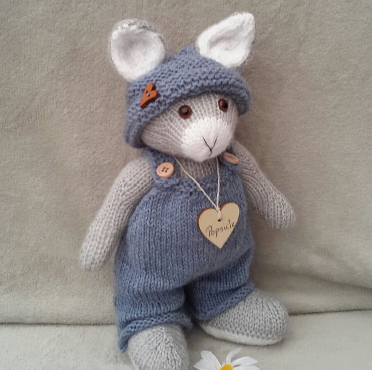 Popsicle was knitted from Cygnet grey Aran yarn with white contrast muzzle, inner ears, foot pads and little bobble tail.