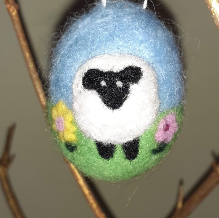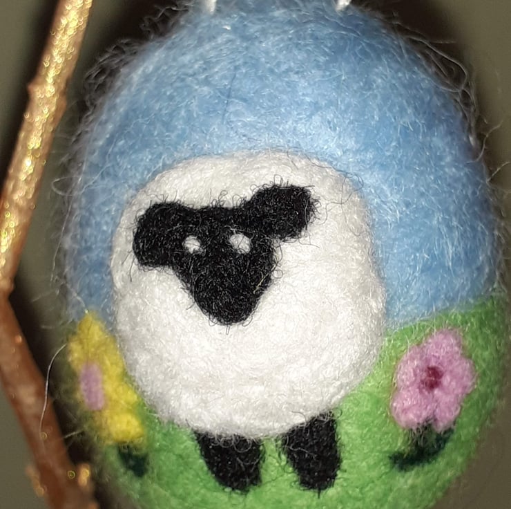 Handmade, needle felted Easter egg with a cream and black sheep design on a blue and green background, decorated with small spring flowers in yellow and pink. Ideal decoration for an Easter tree or elsewhere in your home to celebrate the arrival of Easter or Springtime. Approx. 6 cm x 5cm. Finished with a cream ribbon for haninging