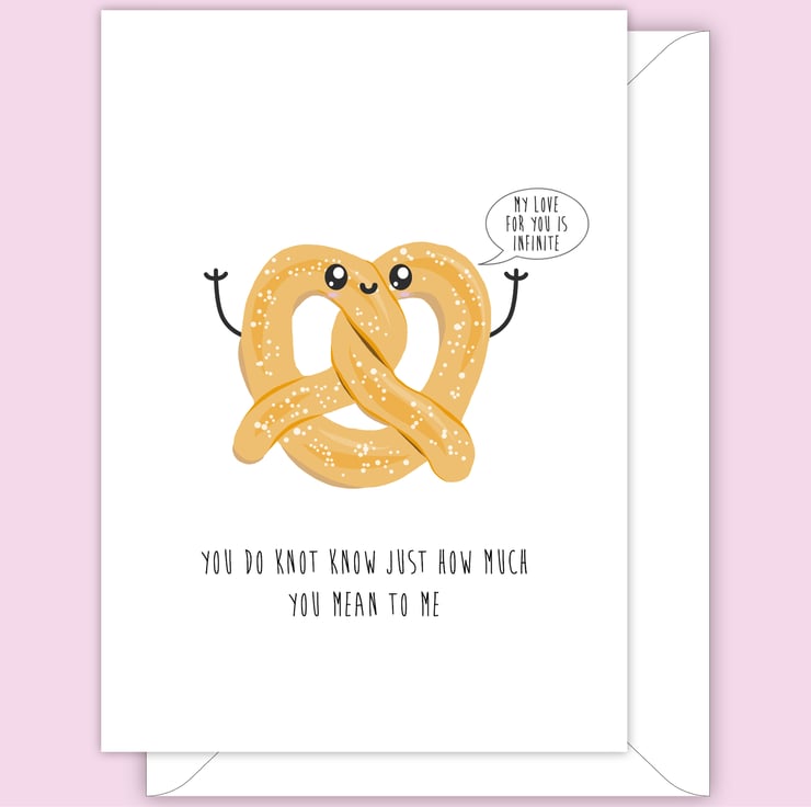 An A6 (folded) anniversary or valentines card made with 350gsm FSC card depicting a hand drawn pretzel and has a happy cartoon style face. The card is silk coated on the outside to make the image pop and matt on the inside so you can easily write your own message.