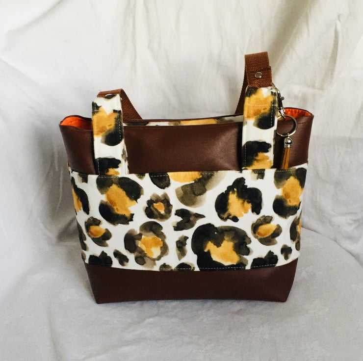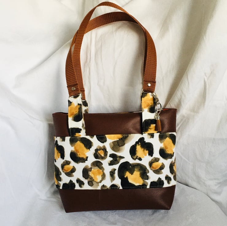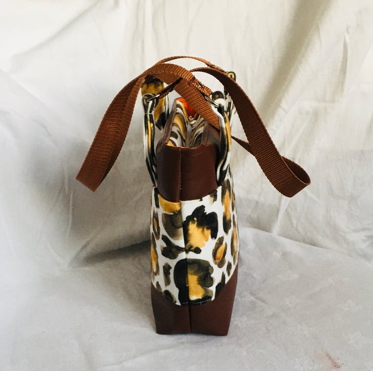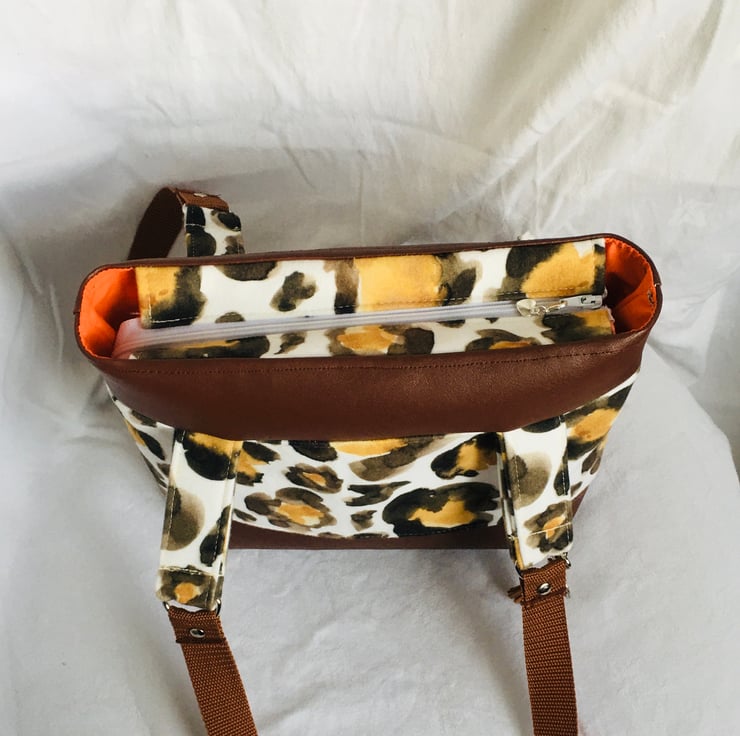 The bag has been made from brown faux leather and Giraffe print coat weight fabric, the lining is an dense weave cotton fabric and the handles nylon webbing, giving strength and stability. The bag not only boasts of a large internal area, there is also another two pockets one open slip and one zipped, finally the main bag is secured with a top zip.