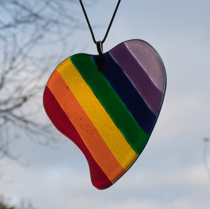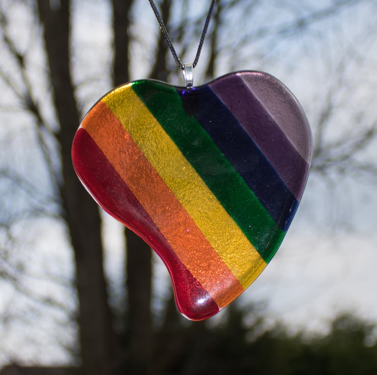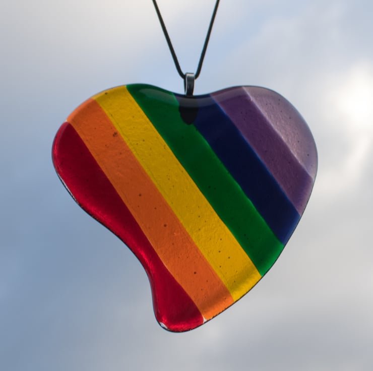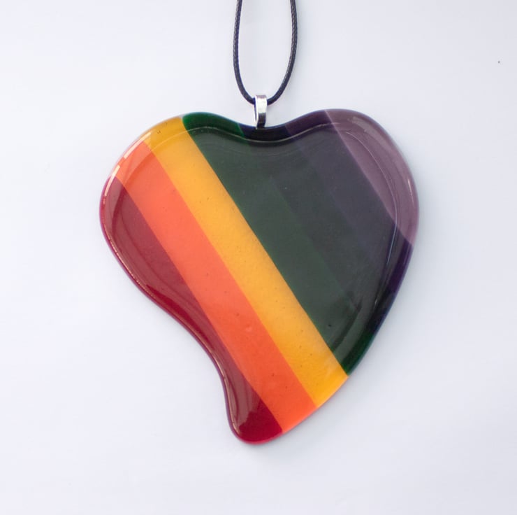The heart is made from 8 pieces of transparent glass, each of which is hand-cut and shaped to form one of the stripes. They are laid out on a separate piece of clear glass which has been cut and shaped to cover the stripes. The glass is fired in the kiln, following a programmed cycle of heating and cooling to form a single piece of heart-shaped glass. Once cooled we glue on the bail and thread the faux leather cord from which it hangs.