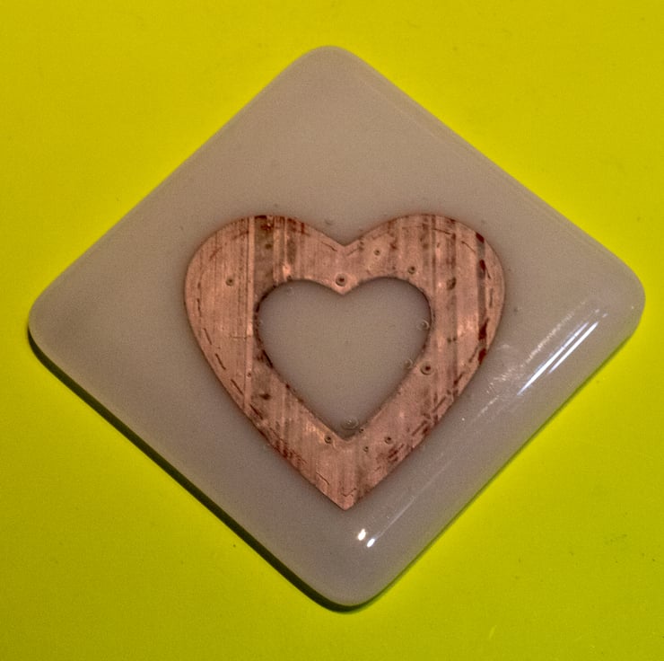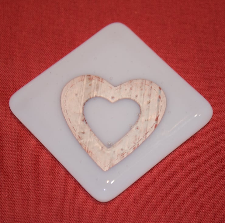 This Fused Glass square is constructed from two pieces of hand-cut glass; a white base and a clear cap. Between the layers, we have sandwiched a heart punched from copper foil.
