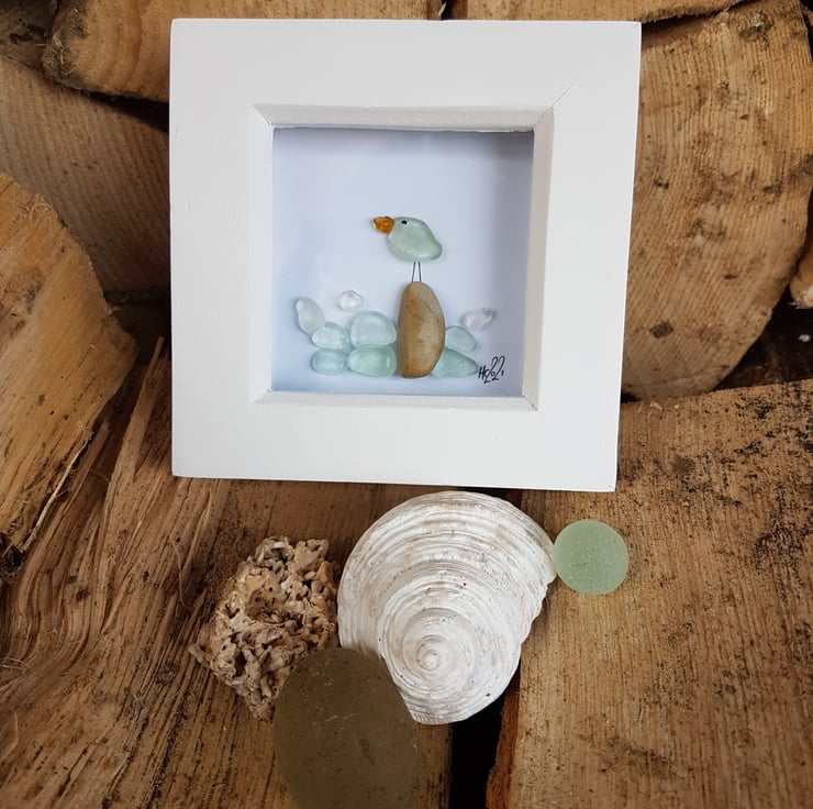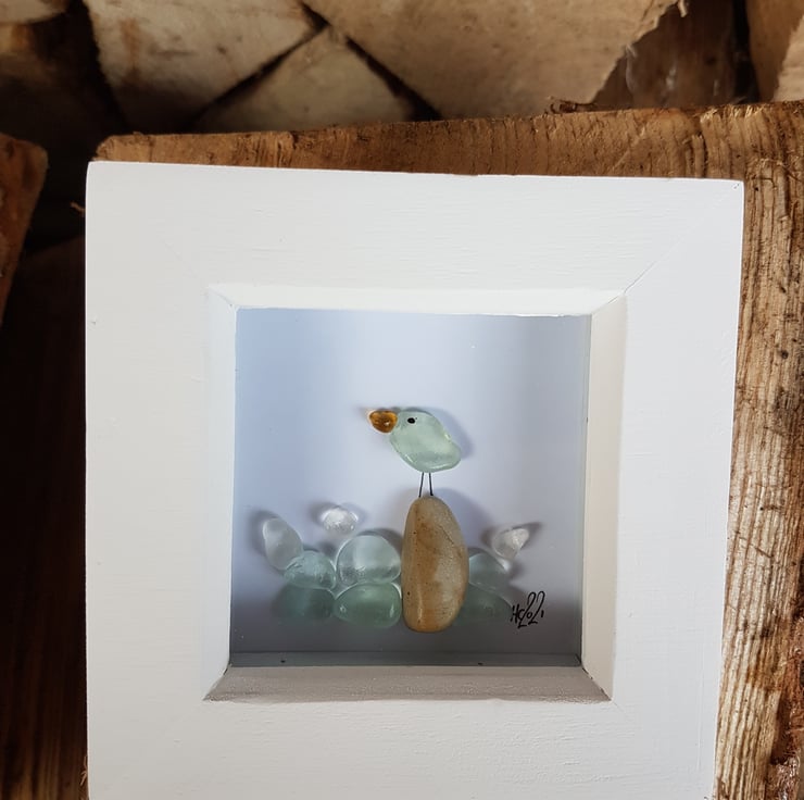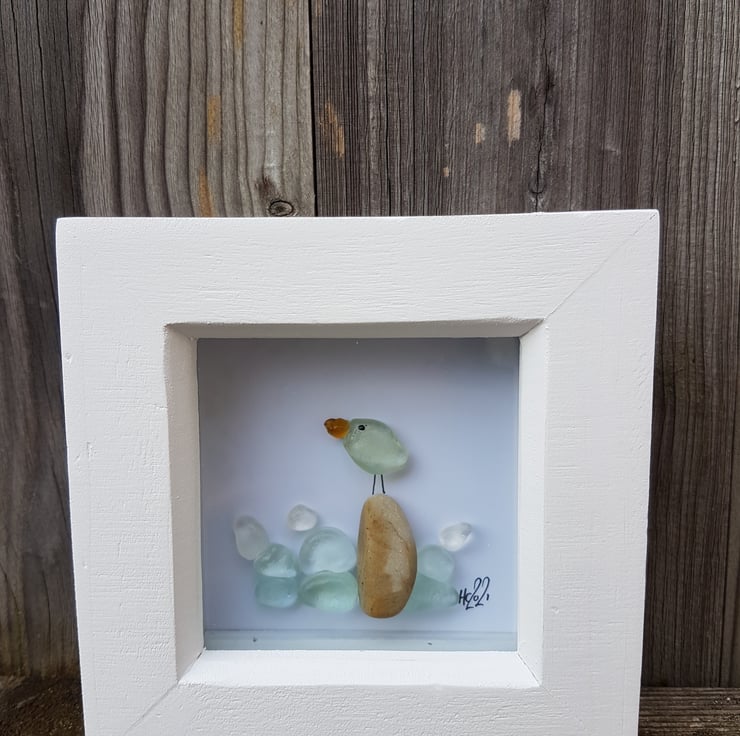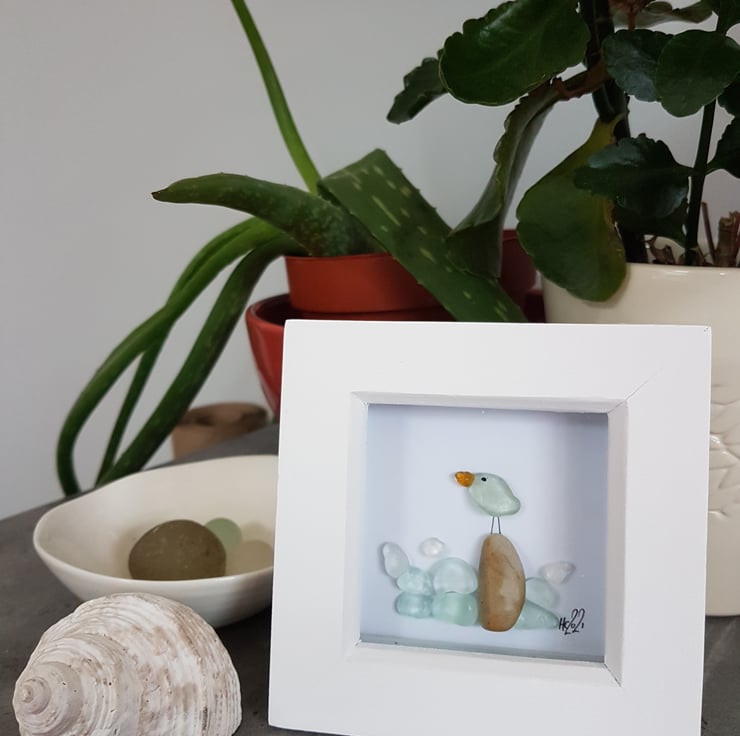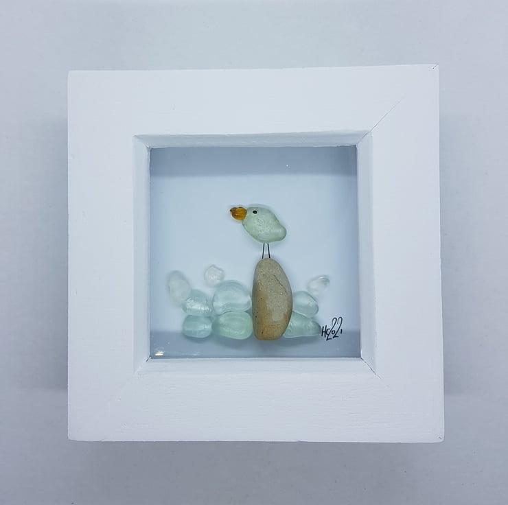 A beautiful lone sea gull made from sea glass and pebbles collected from Seaham in the North East of England.