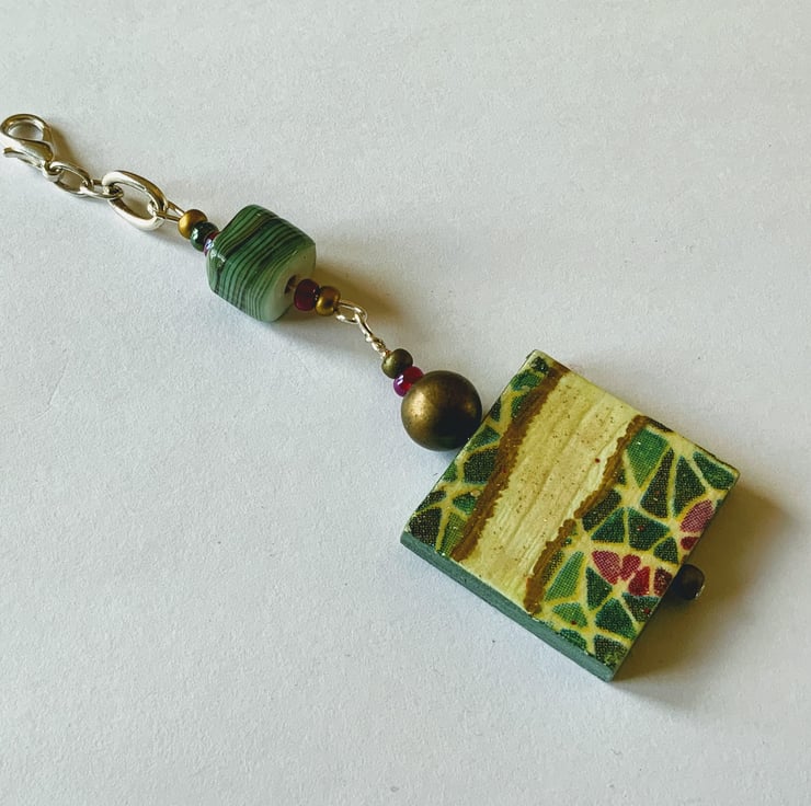 The square bead is hand painted and decoupaged in a bright vivid rustic design in yellows greens and a touch of dark red. The wood is sealed with a protective varnish.