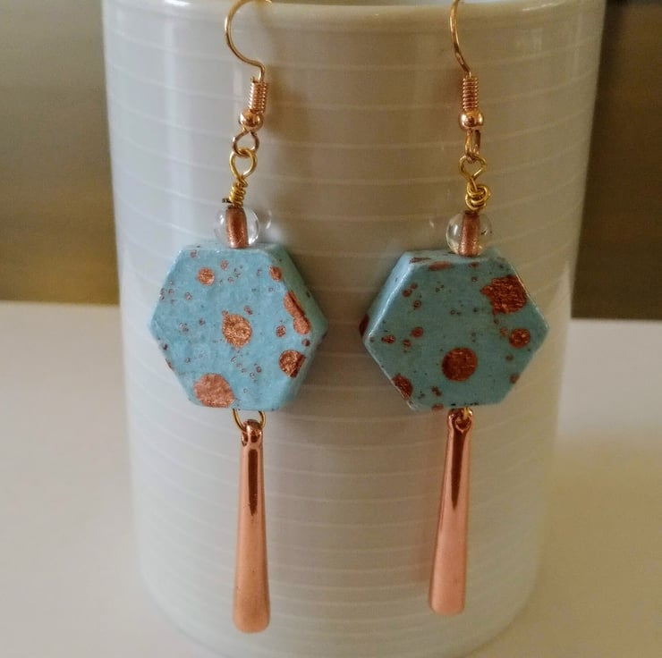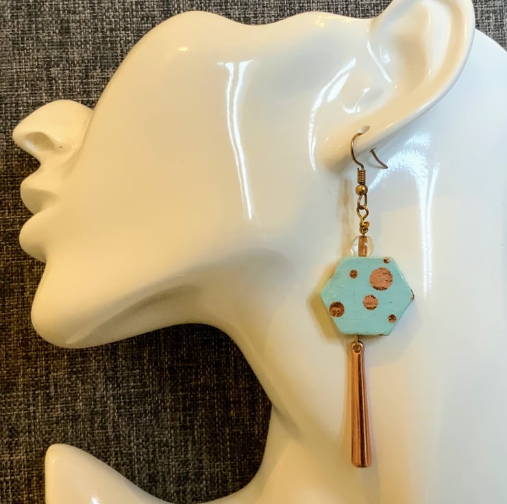 Hexagon hand painted and decoupaged wood earrings in a sky blue and rose gold design.