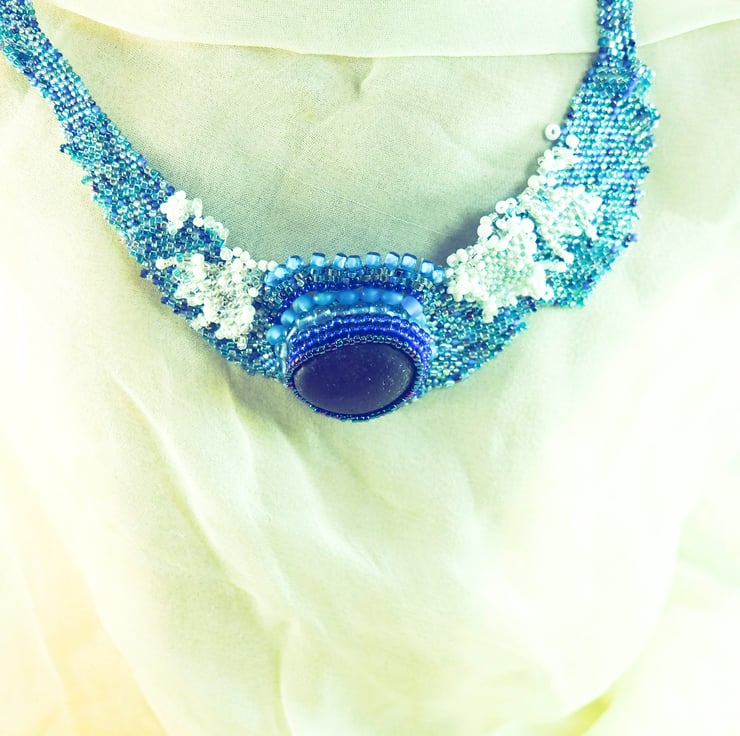 The necklace is made using needle weaving to reflect a curling wave on the sea. The sea glass in this case is quite thick so it'a quite prominent on the necklace.