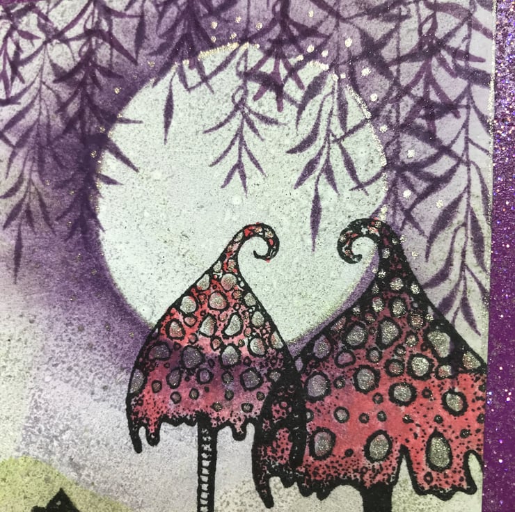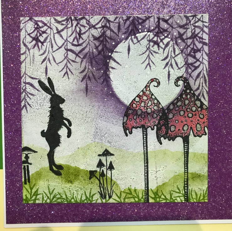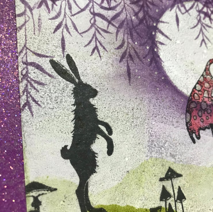 The background has been created with Distress inks and the images are of a standing hare and toadstools from Lavinia stamps and is hand stamped. All cards have been handmade by me and no two cards are the same.