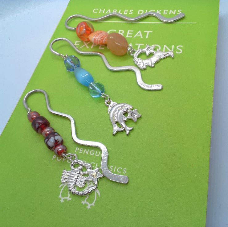 These pretty and practical silver plated bookmarks would make an ideal gift for any book lover that you know, or a treat from yourself or a lovely thank you gift for a well liked teacher. There are 3 to choose from so far. The bookmark base is silver plated and in the shape of a squiggle. There are 3 different designs to choose from so far: