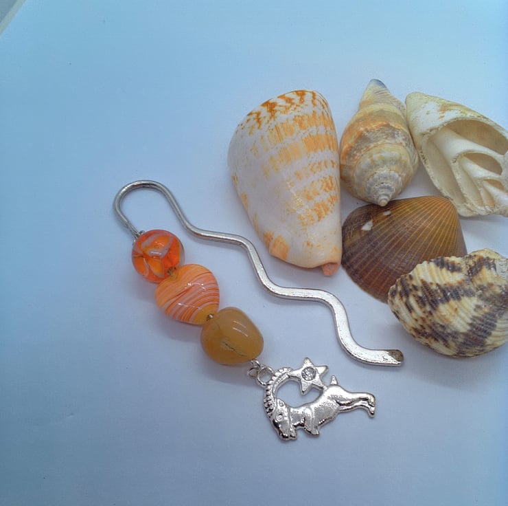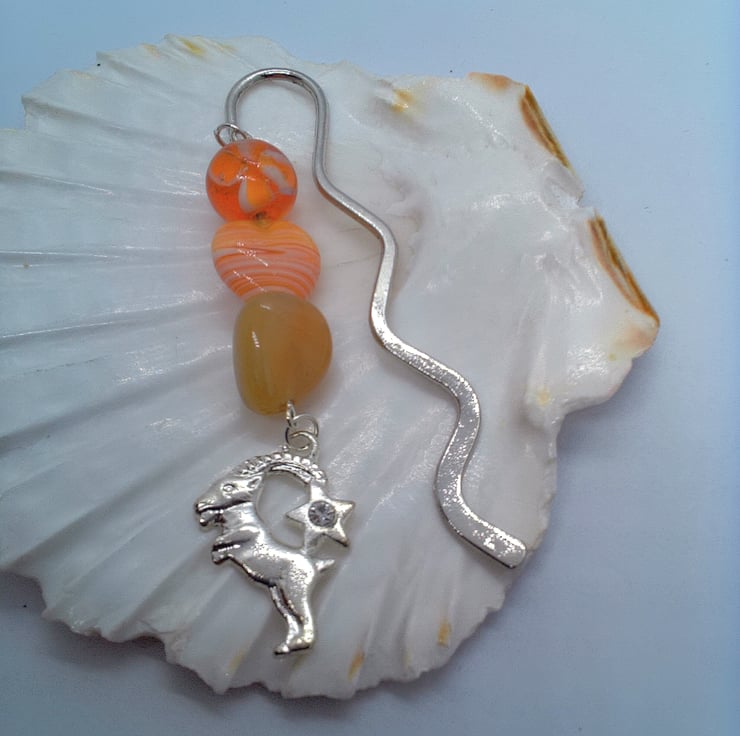2) has 10 mm round orange lampwork bead, orange 10 mm x 10 mm orange heart bead and a 12 mm orange nugget beads with a silver plated Capricorn star sign charm made into a beaded chain. The Bookmark is 8 cm in length.