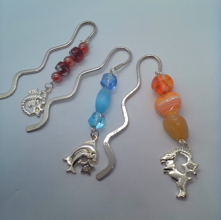 1) has 4 mm x 8 mm x 6 mm red drum beads and 6 mm x 6 mm red round beads with a silver plated Scorpio star sign charm made into a beaded chain. The Bookmark is 8 cm in length.