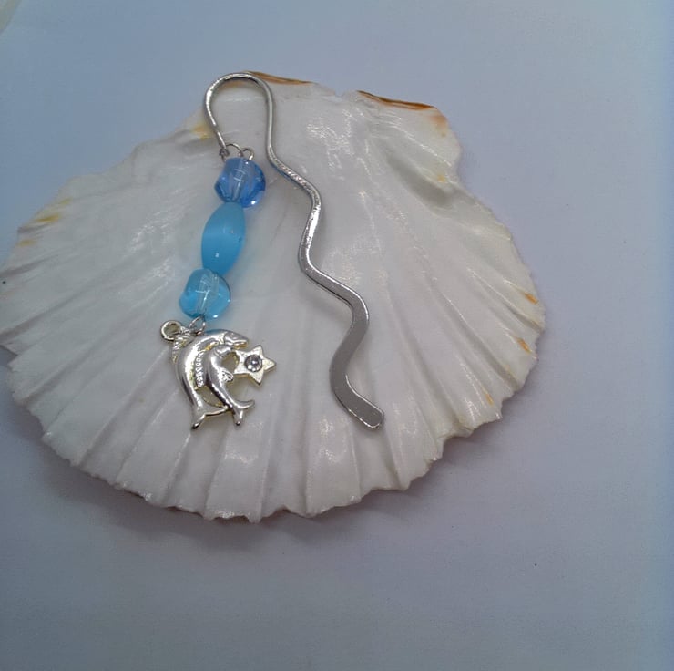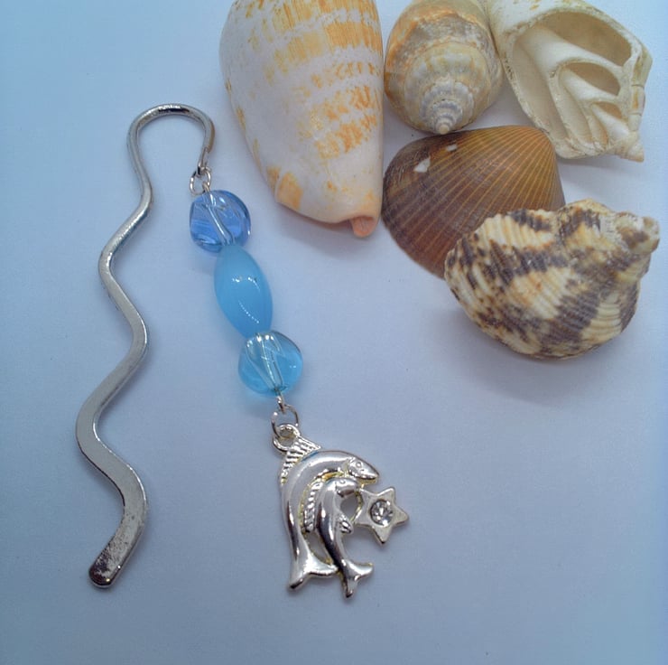 3) has 4 mm x 10 mm blue draw bench beads and 2 x 15 mm x 6 mm faceted long oval beads with a silver plated Pisces star sign charm made into a beaded chain. The Bookmark is 8 cm in length