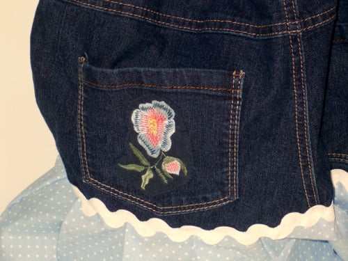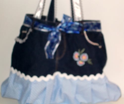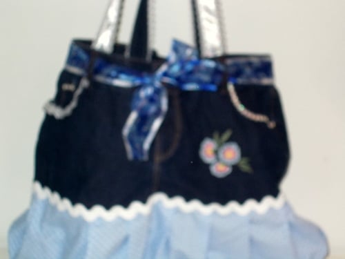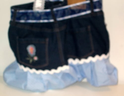 This bag has been made from a pair of size 14 jeans. It is lovely and roomy measuring approx. 40cms wide and 30cms deep. It from the top of the jeans so has all the pockets in place. the lining is blue gingham. The pockets have been trimmed. The skirt frill is pale blue with white spots and ricrac trim. The handles are made from denim with ribbon and lace trim. They measure approx. 60cm long. Also there is a scarf threaded though the belt loops.